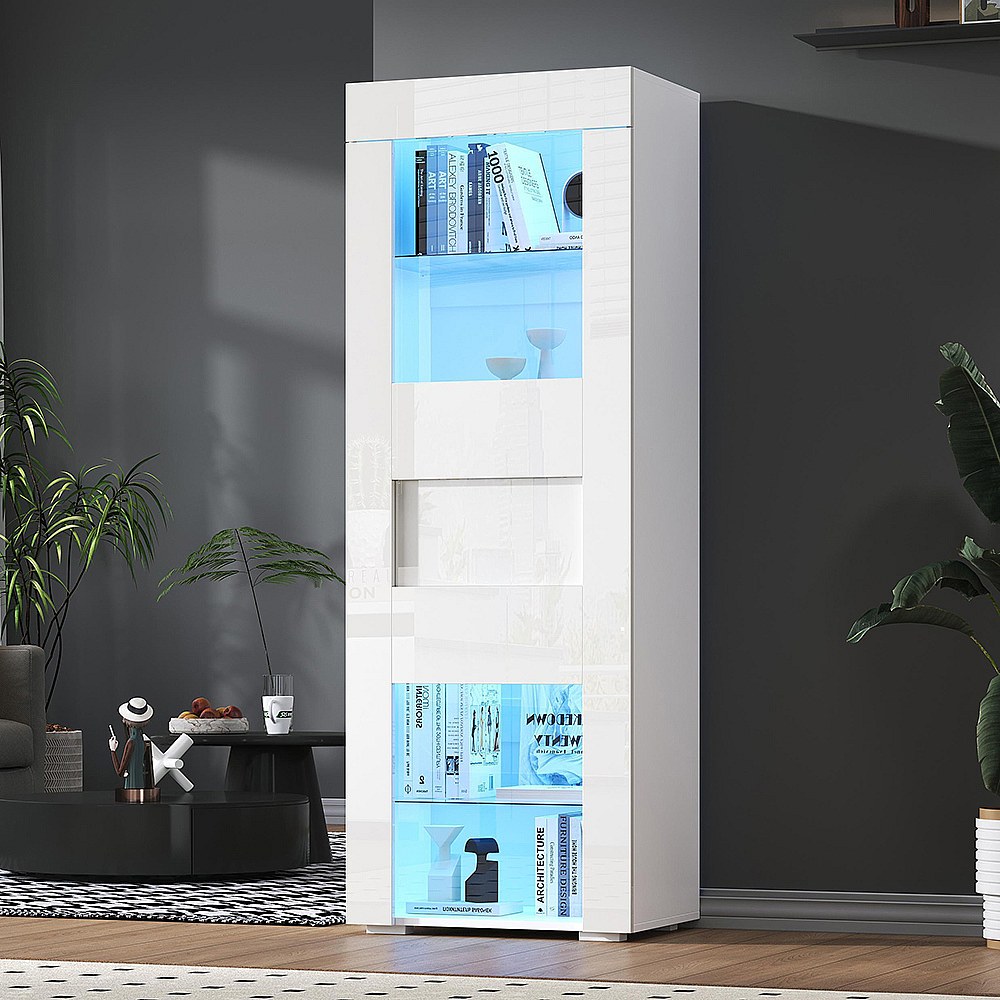Vitrine armoire haute 1 tiroir 4 placards verre LED brillante design buffet salon présentoir blanc