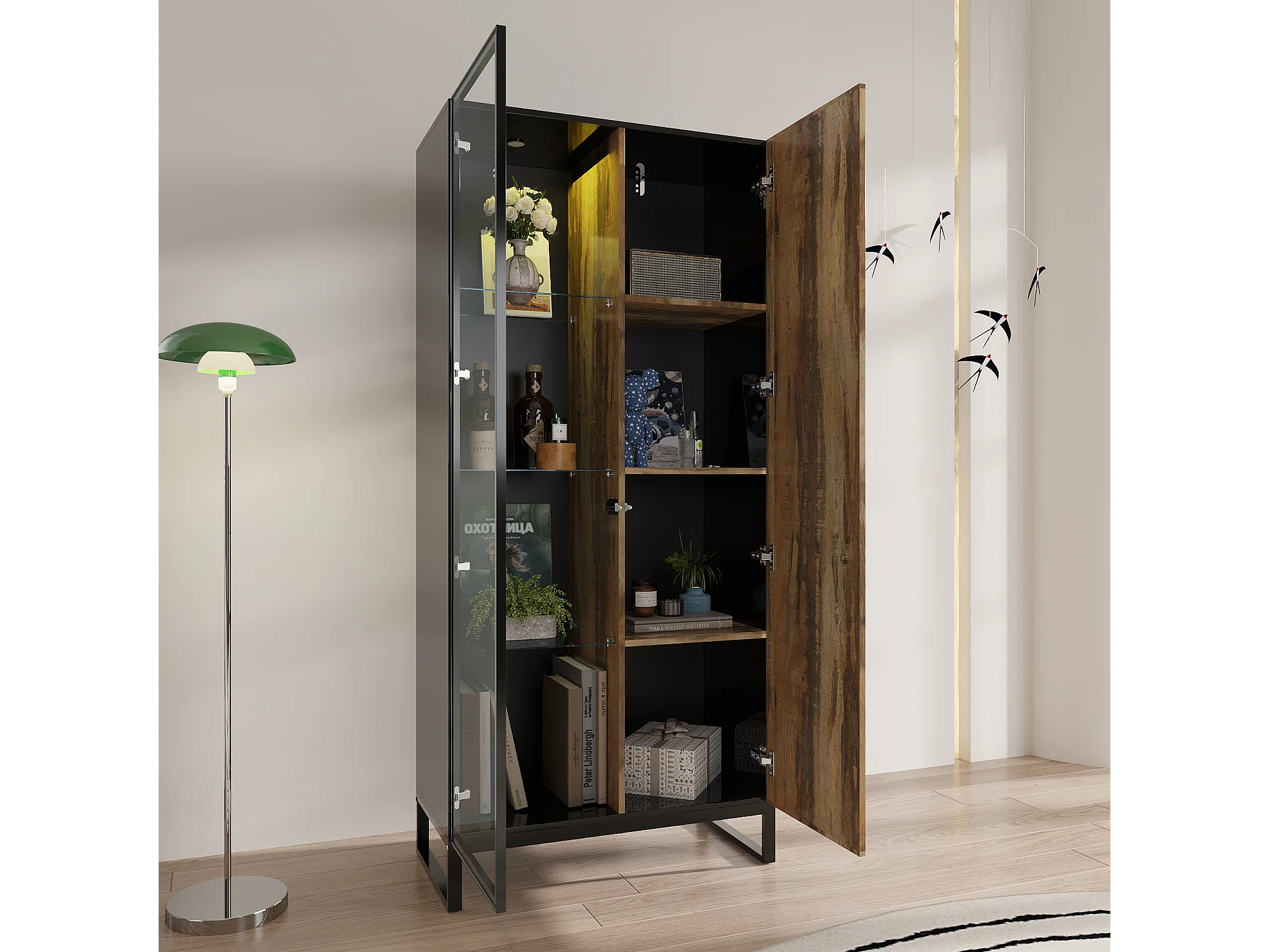 Vitrine avec LED 8 couleurs - 2 portes et à 4 niveaux - Design Pop-up, 80x41x175, noir et naturel