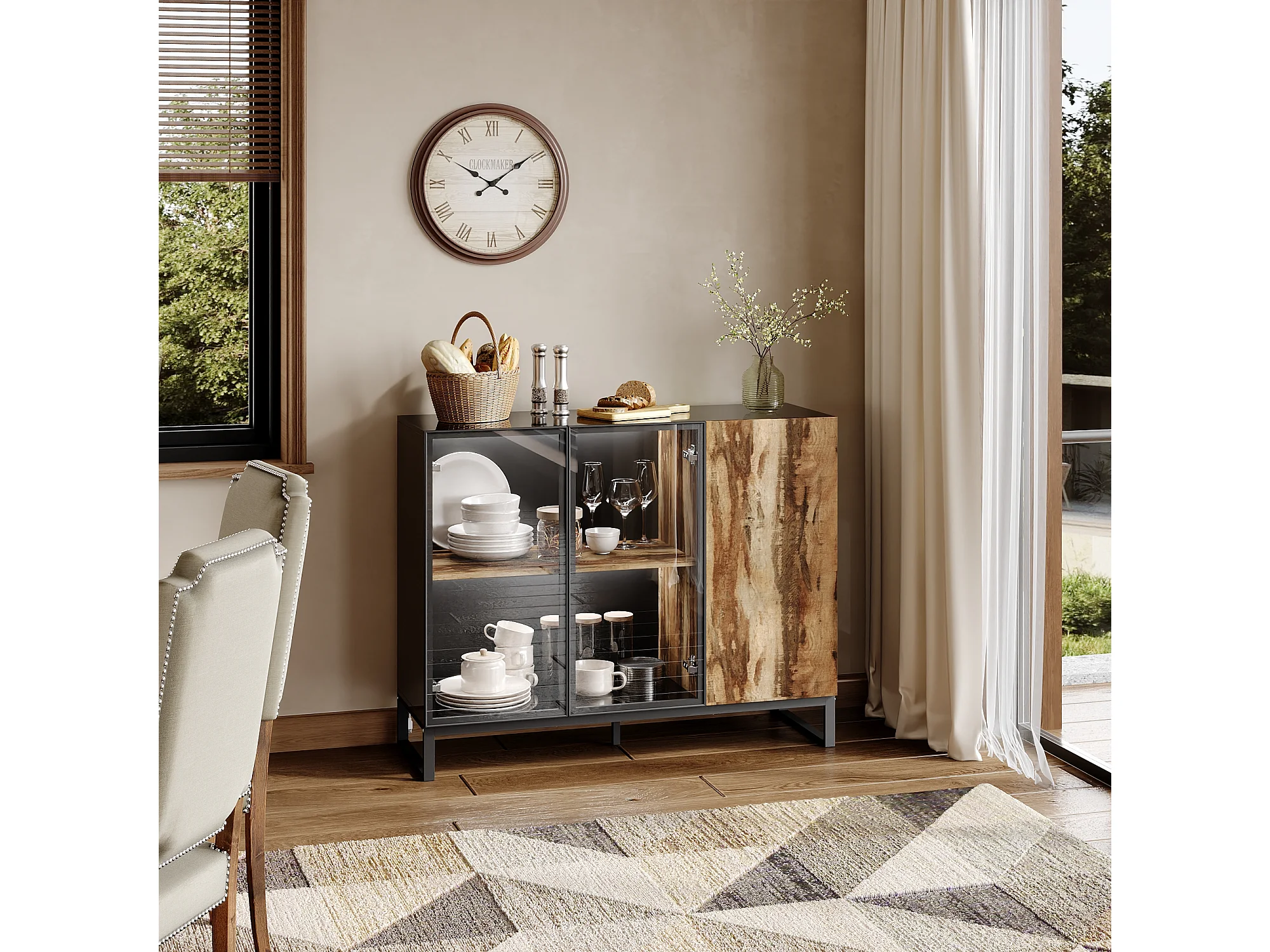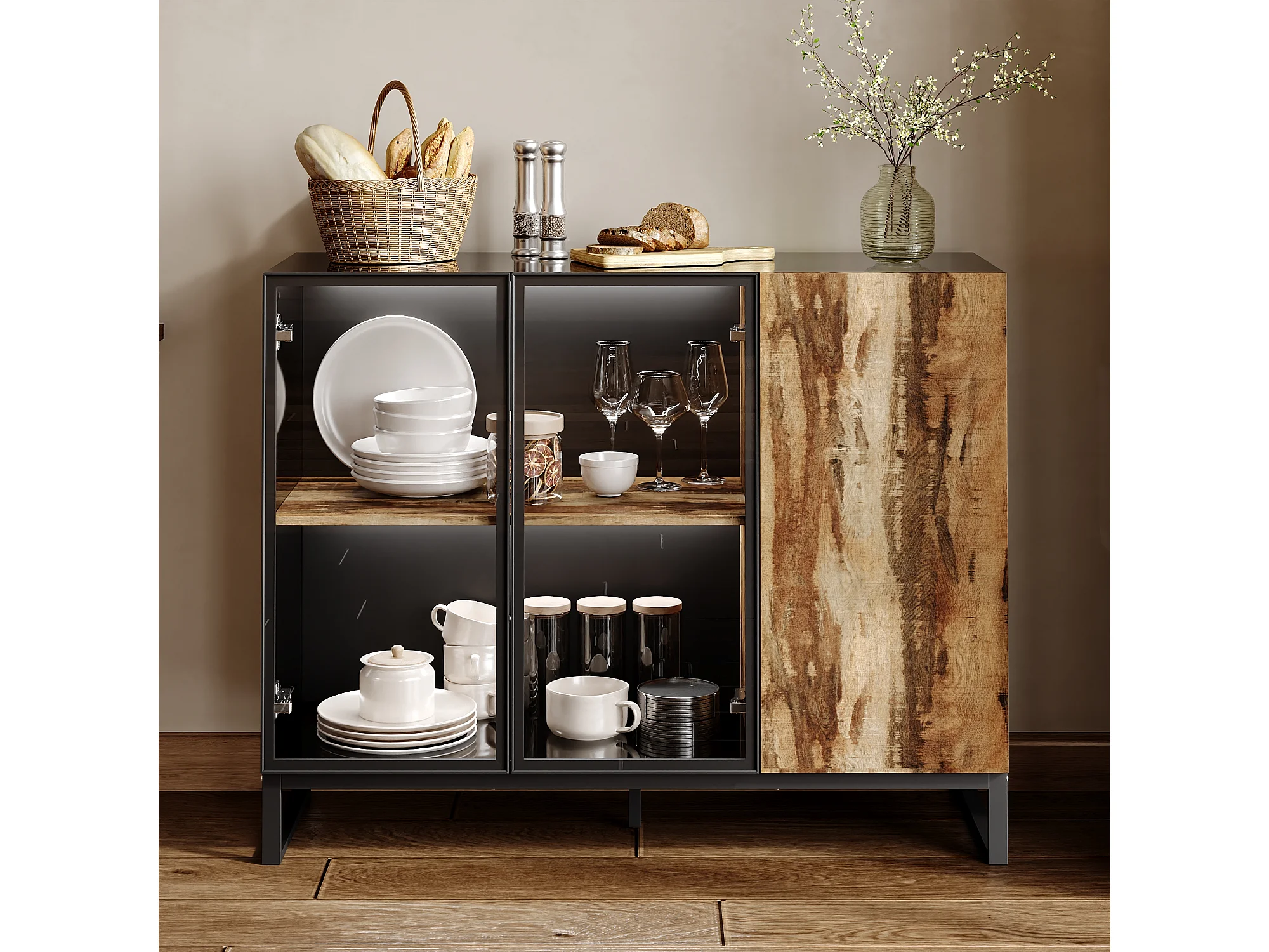 Vitrine avec 2 Porte en Verre et 1 Porte avce Aspect du Bois, Buffet de Cuisine avec Lumière LED, Salon, 120x41x95, Noir