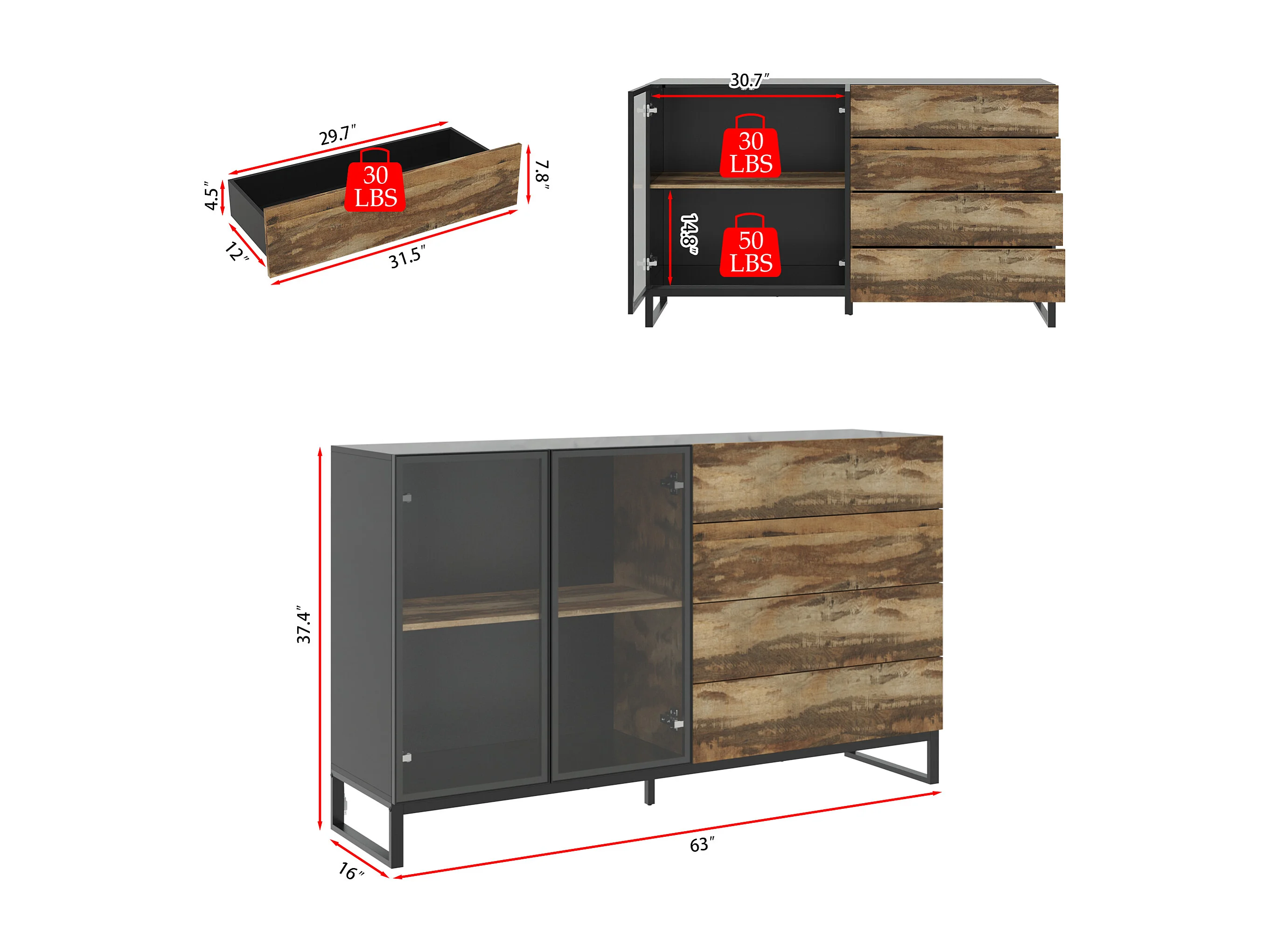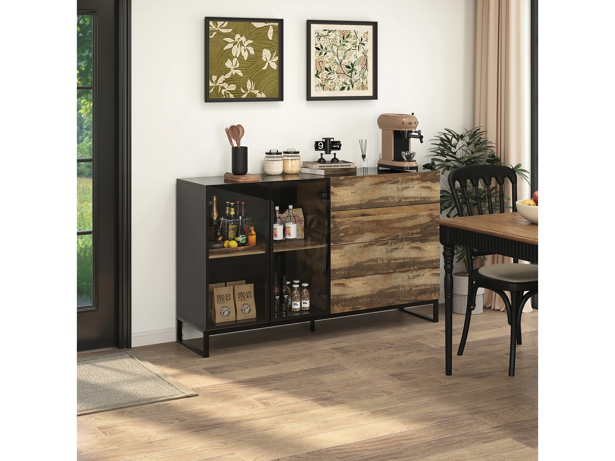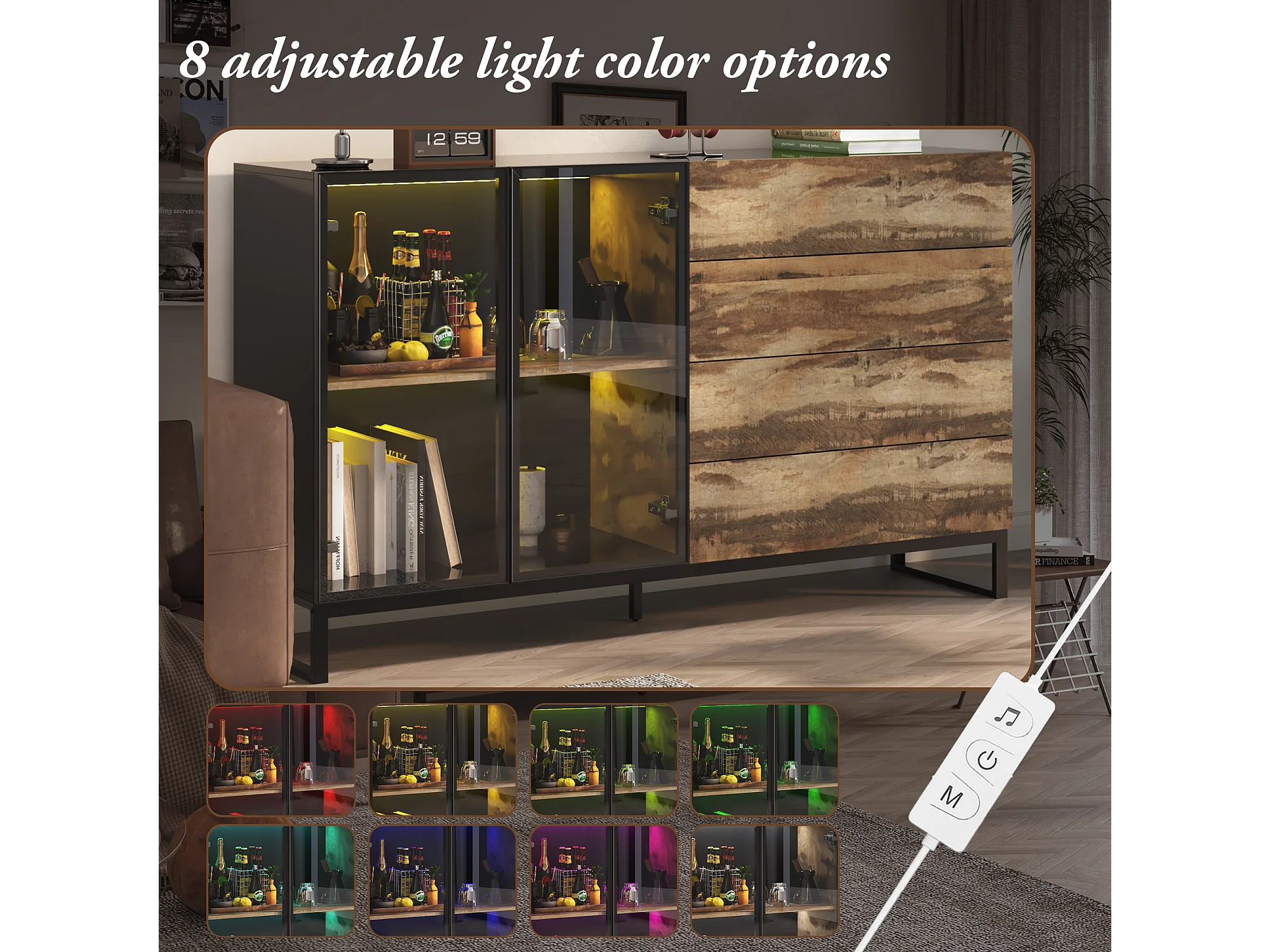 Vitrine avec 2 Porte en Verre et 4 Tiroirs avce Aspect du Bois, Buffet de Cuisine avec Lumière LED, Salon, 160x41x95, Noir