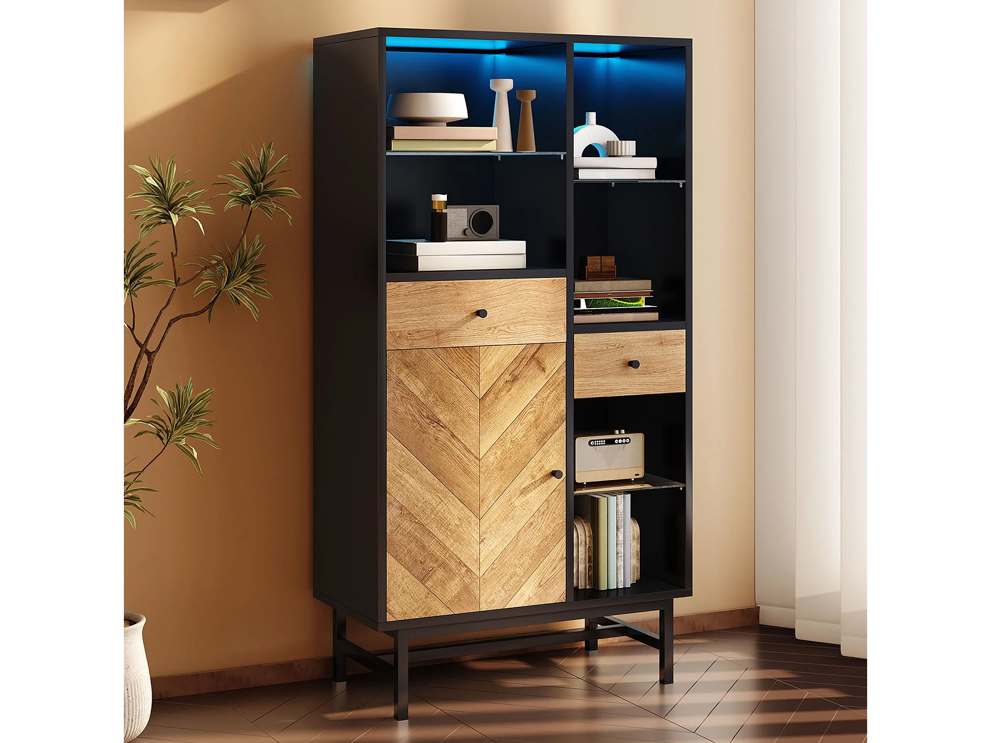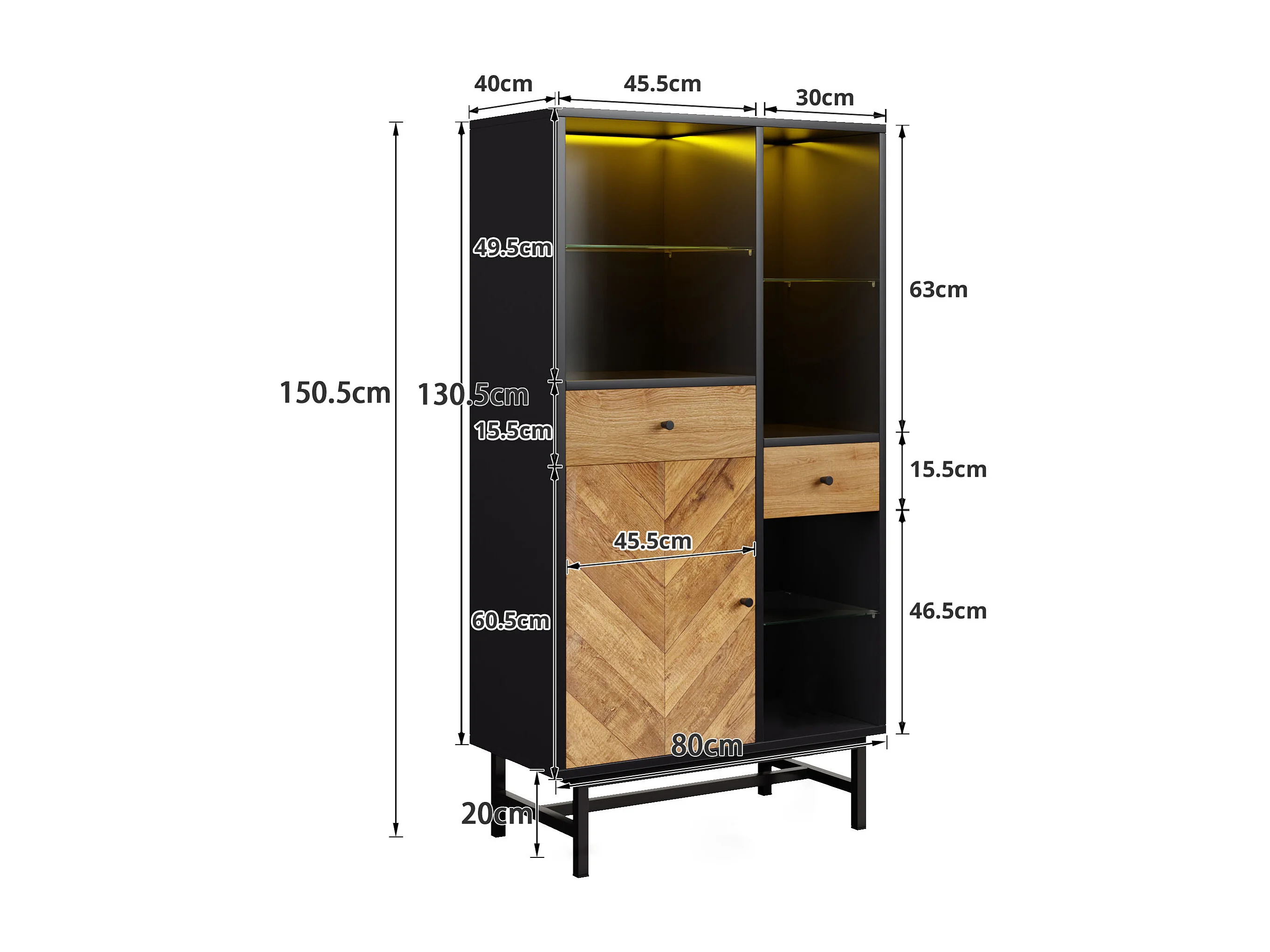 Vitrine avec 2 tiroirs et 1 porte - 80 x 40 x 150.5 cm - LEDs - Etagères en verre - Panneaux de particules - Couleur noir