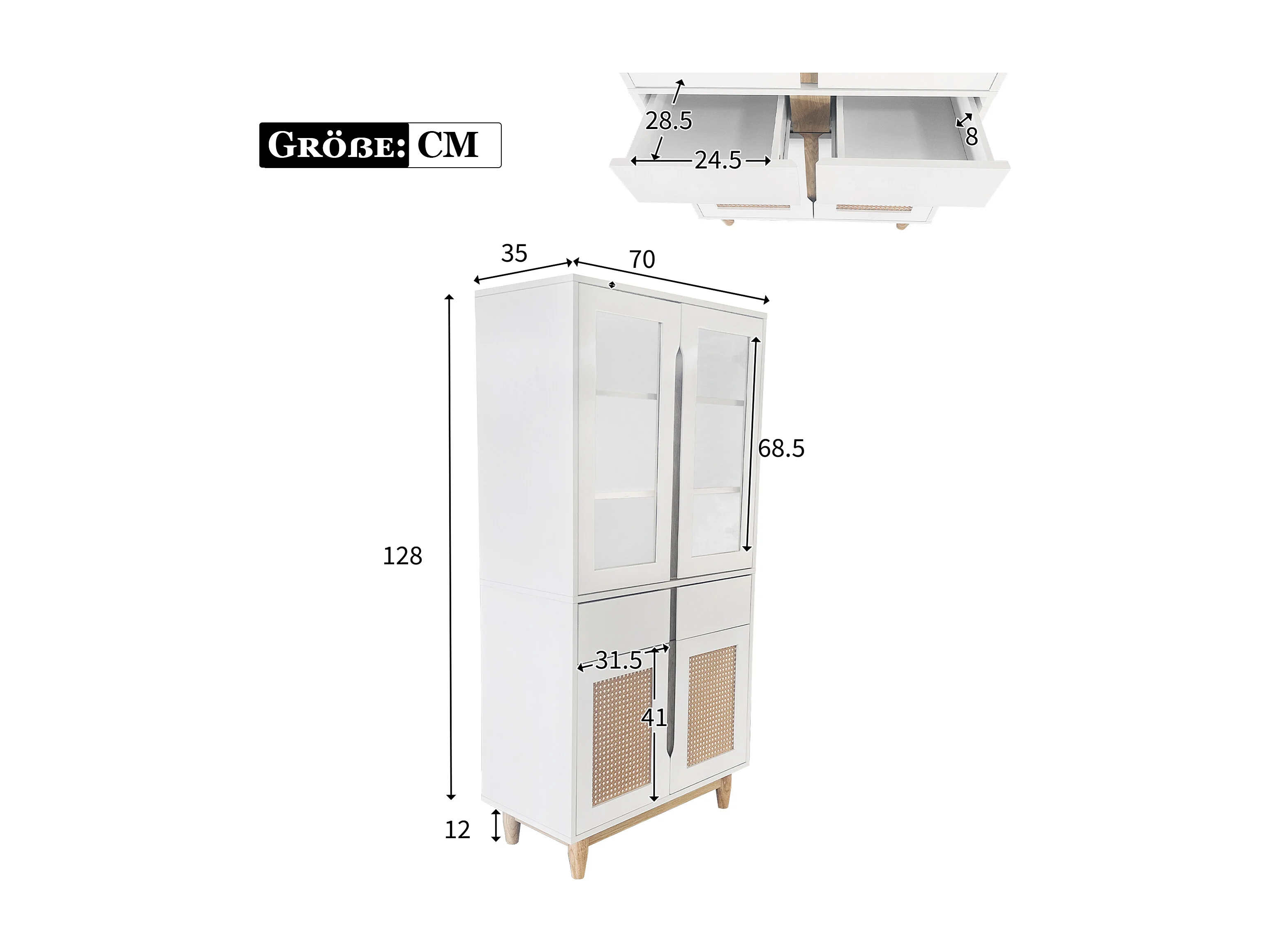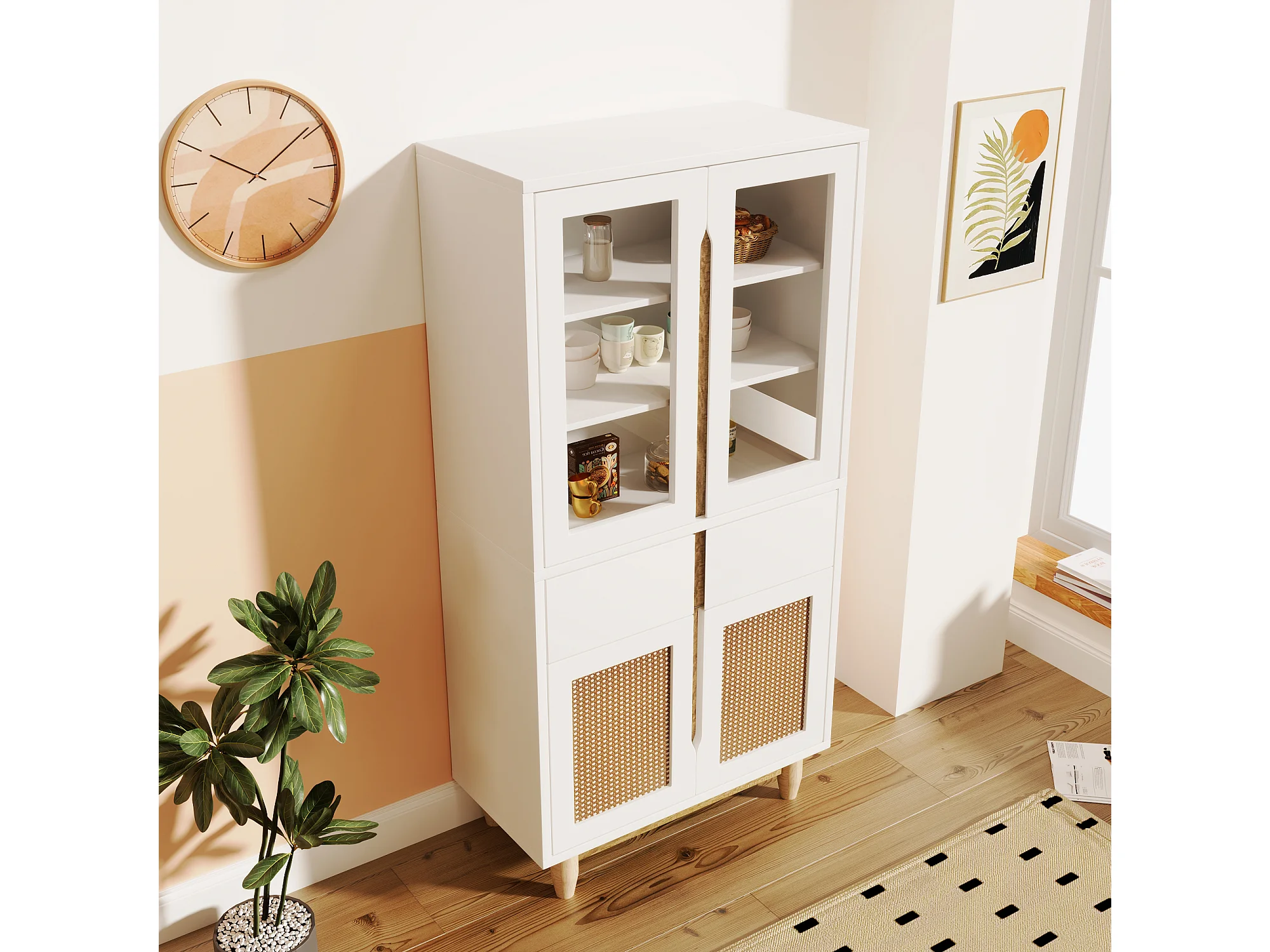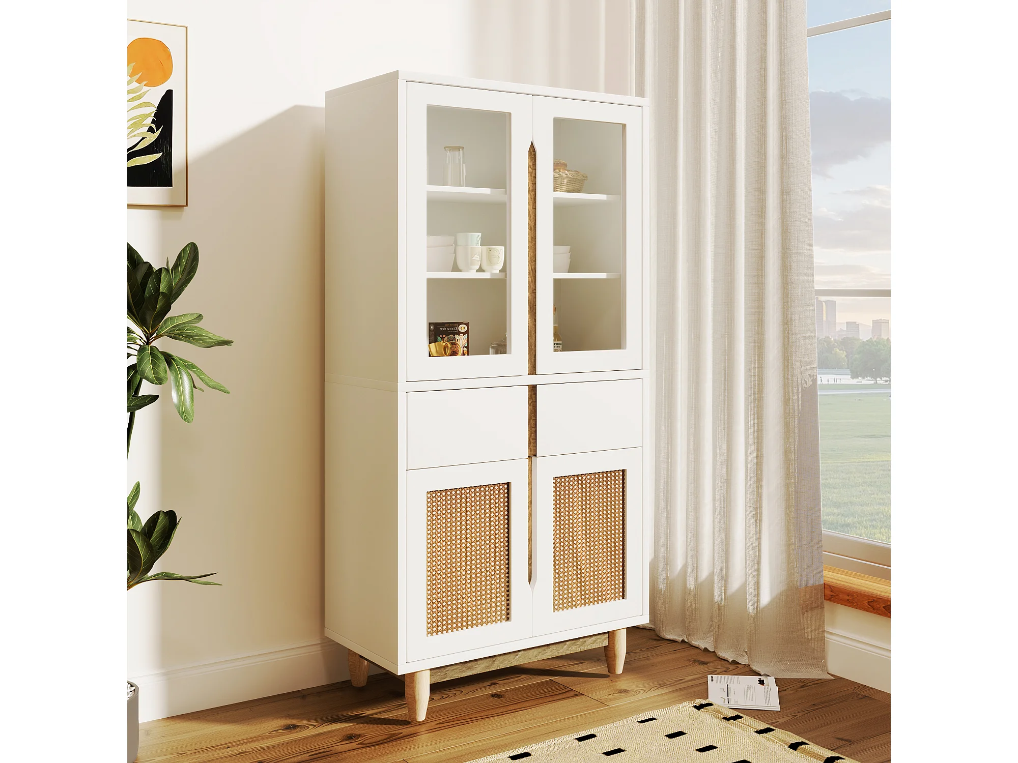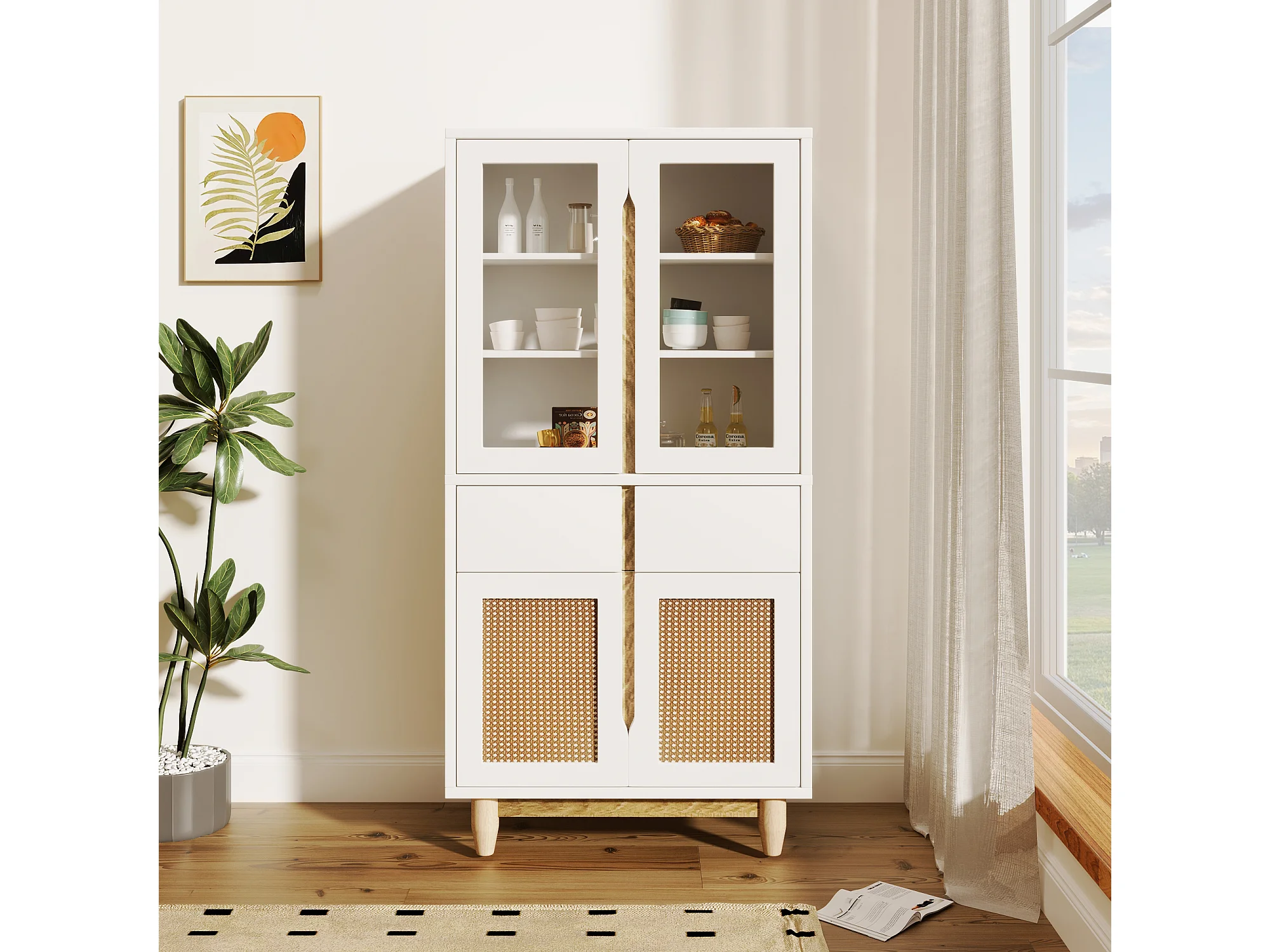 Vitrine avec 2 tiroirs et 4 portes - imitation rotin et acrylique - 128x35x70cm - Bois MDF - Blanc