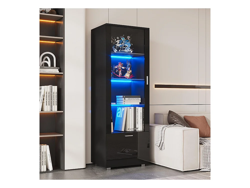 DEYTON - Vitrine Droite Laquée Noir et Blanc Brillant avec Leds