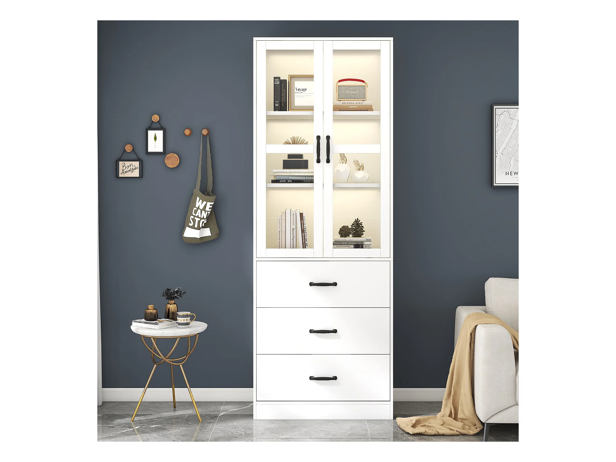 Vitrine bibliothèque LED 2 portes en verre 3 tiroirs - meuble de rangement en bois - blanc (60x40x200 cm)