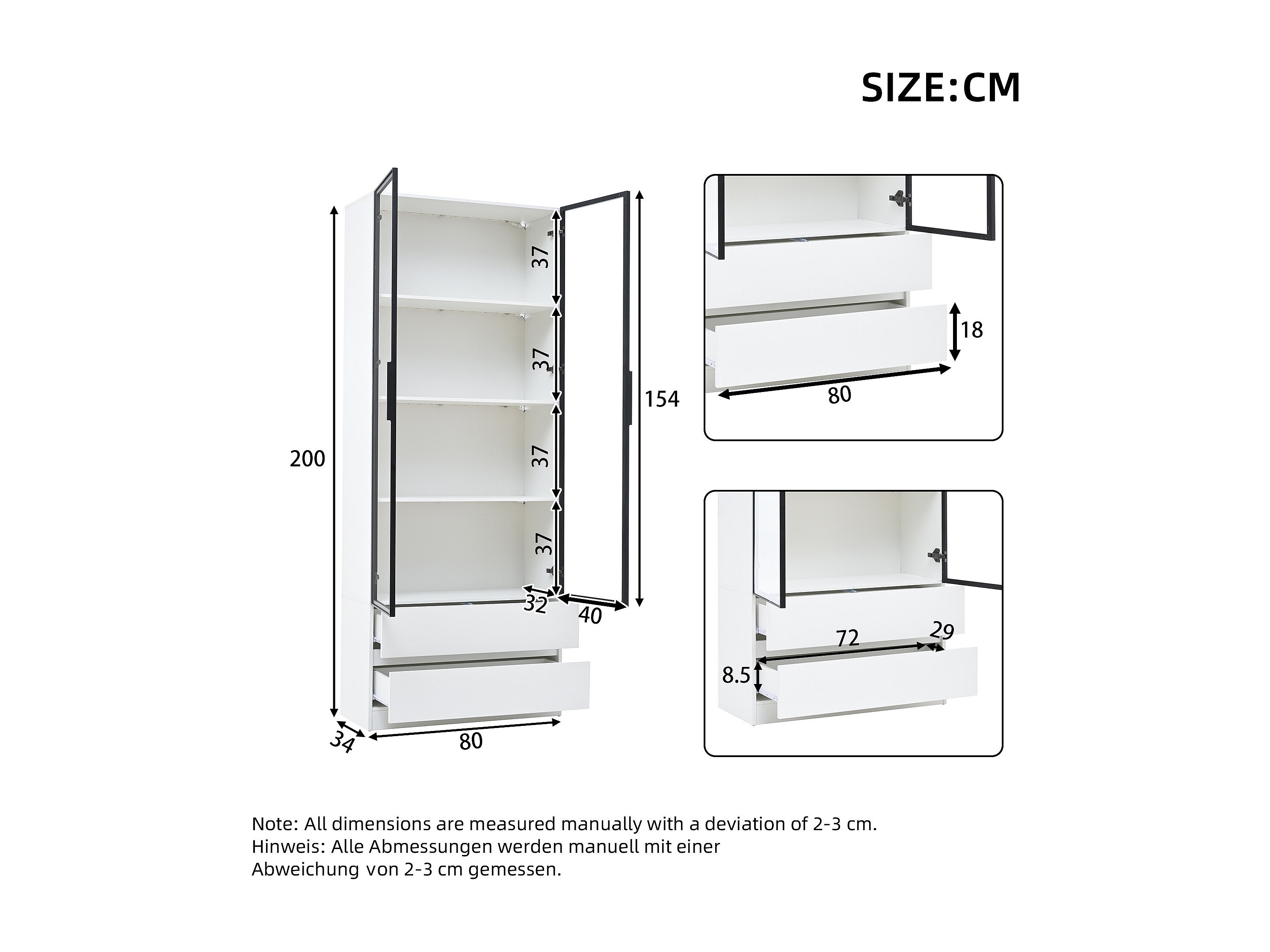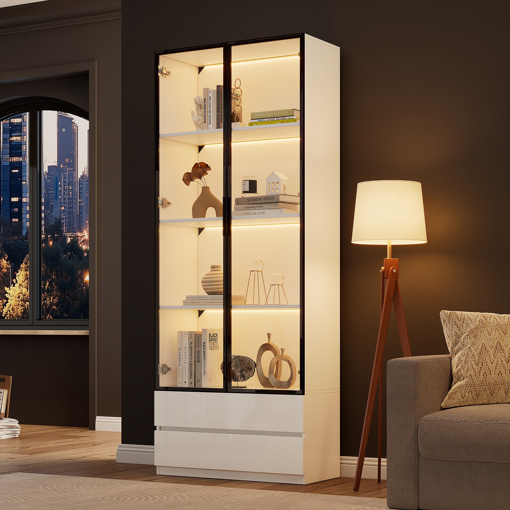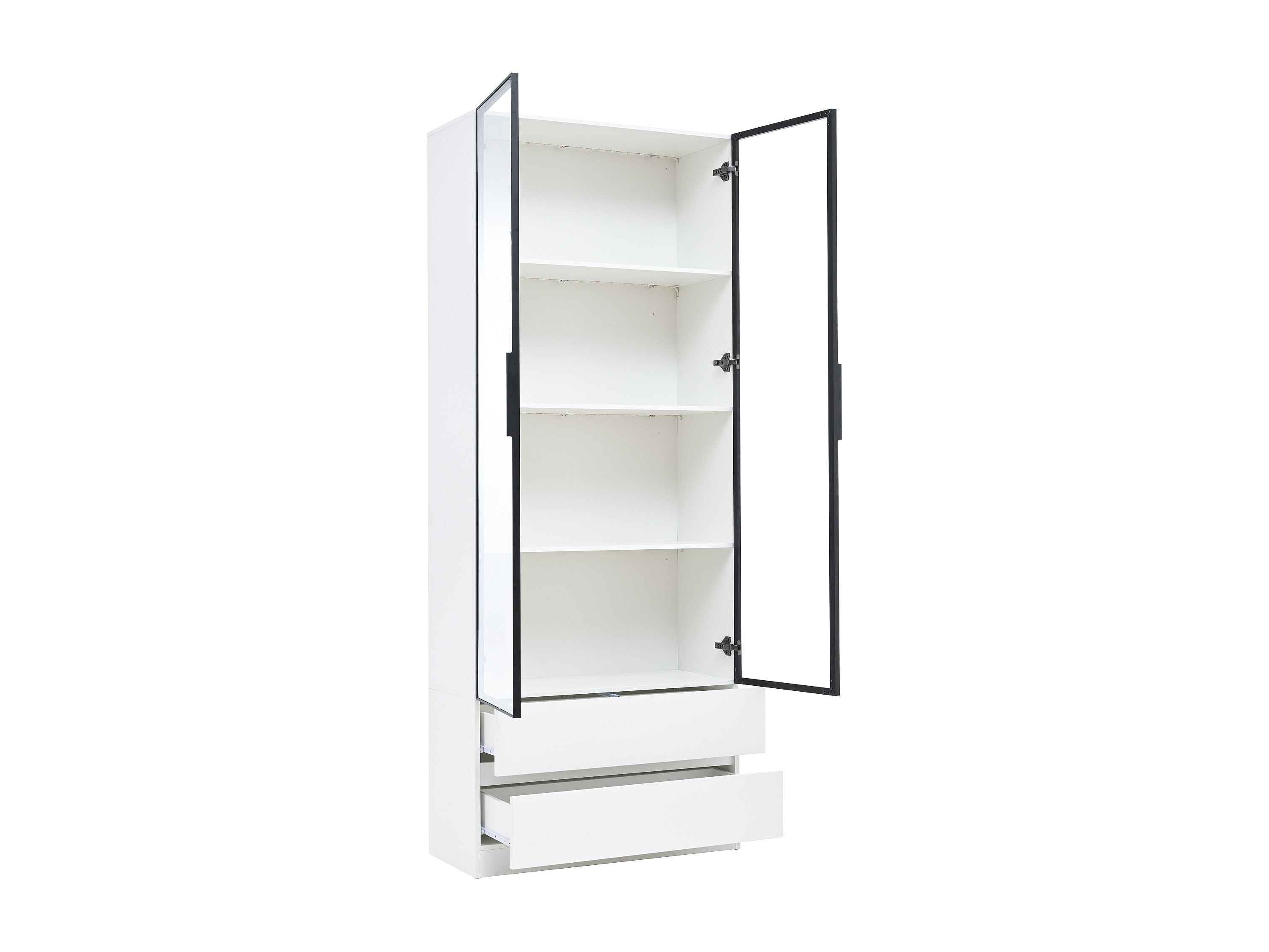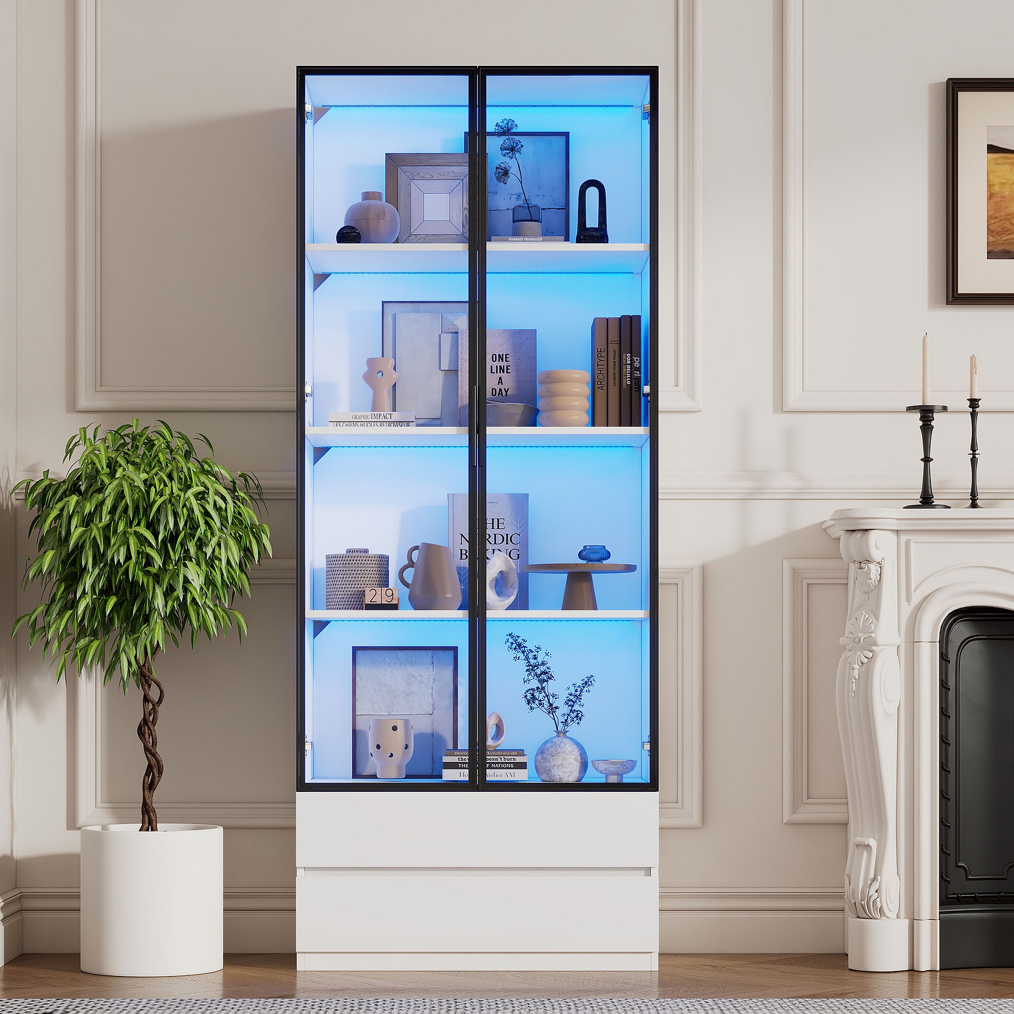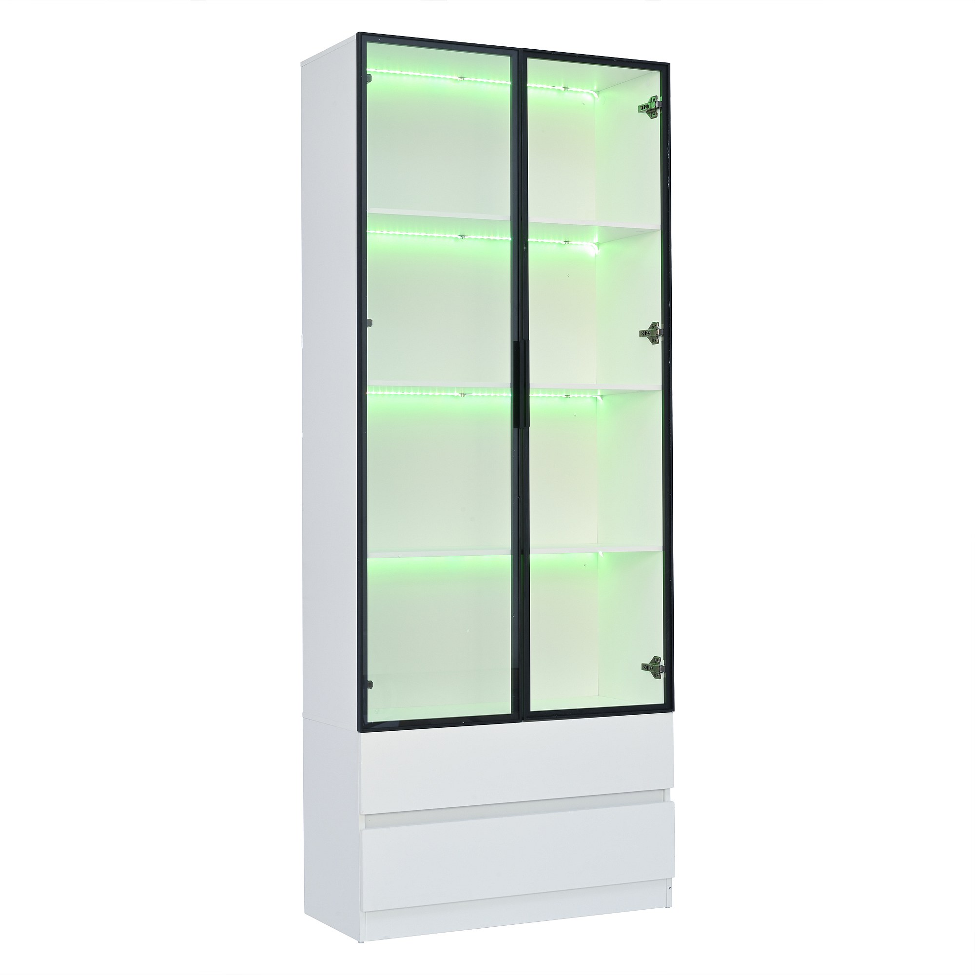 Vitrine blanc avec éclairage LED - Vitrine 2 portes vitrées et 2 tiroirs - 4 compartiments de rangement