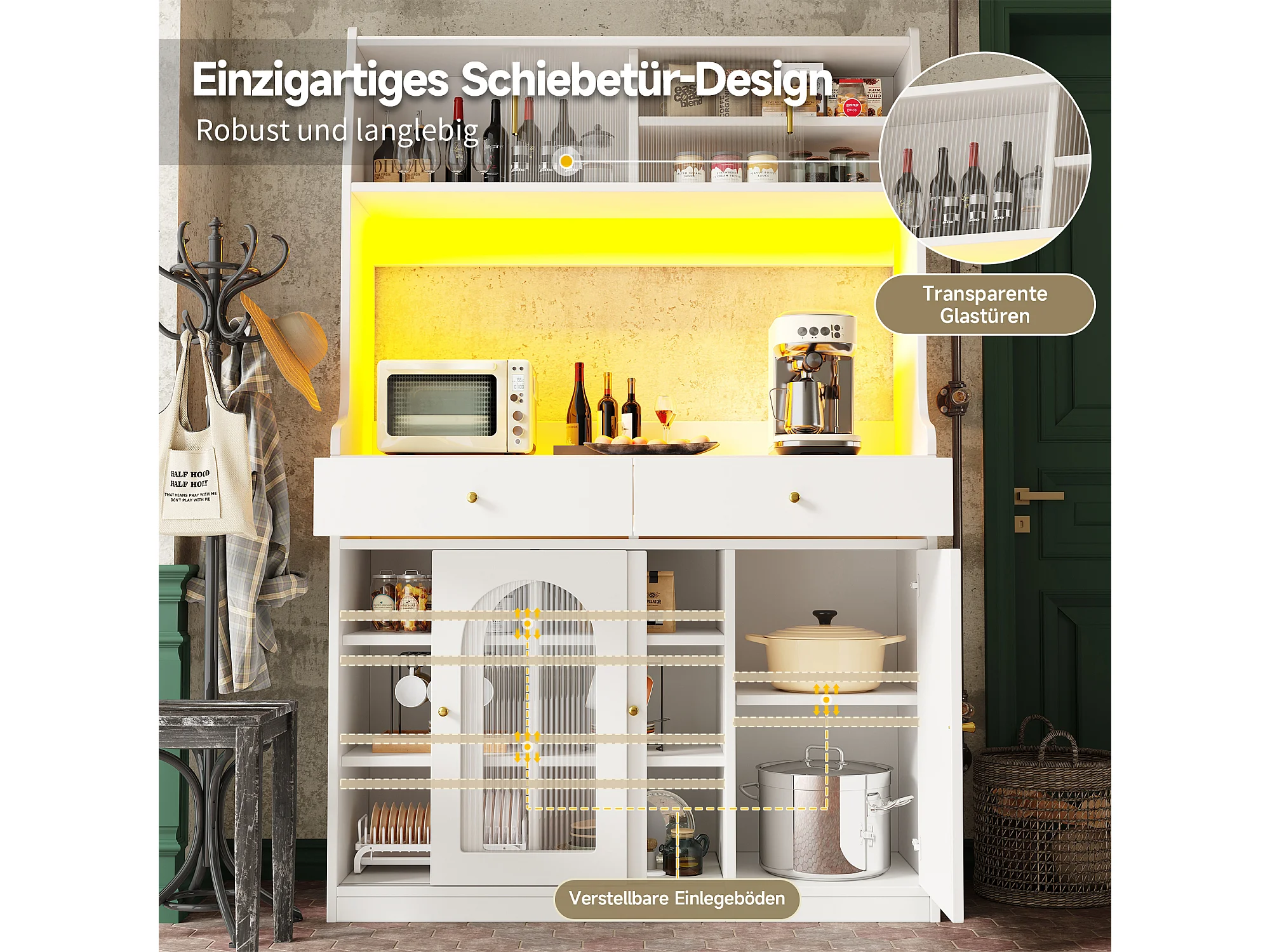 Buffet haut blanc - Buffet avec 2 tiroirs et 5 portes - étagères réglables et éclairage LED