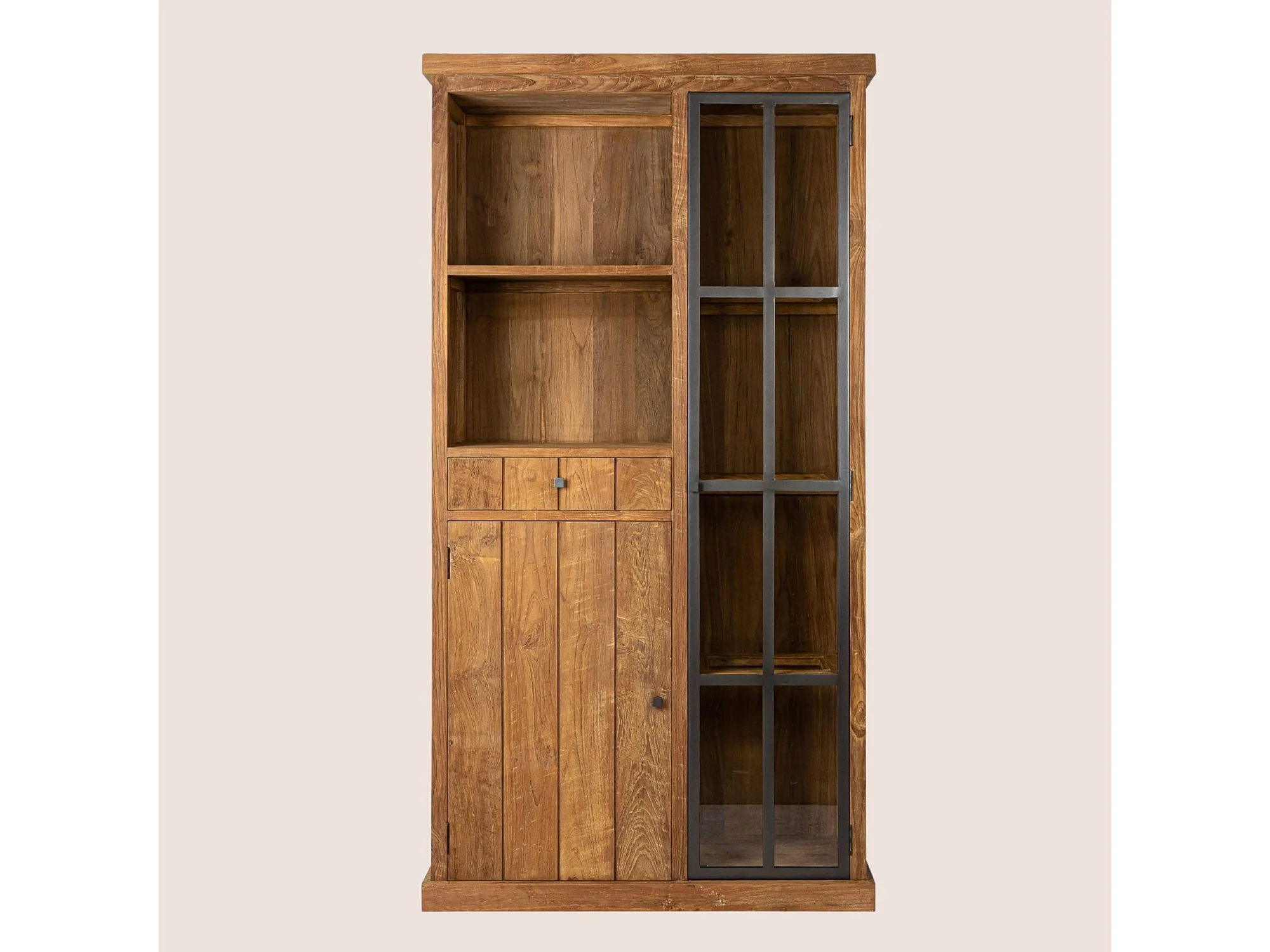 Vitrine en bois recyclé et métal 2 portes 2 tiroirs 2 niches ouverte - LINAS