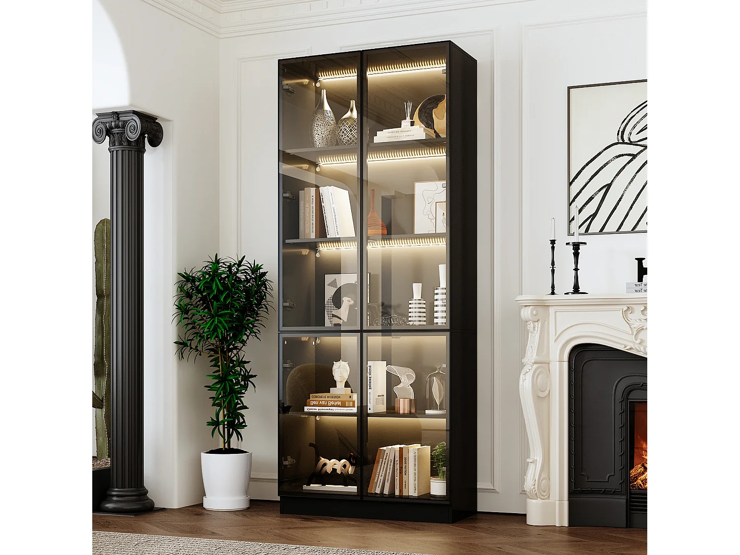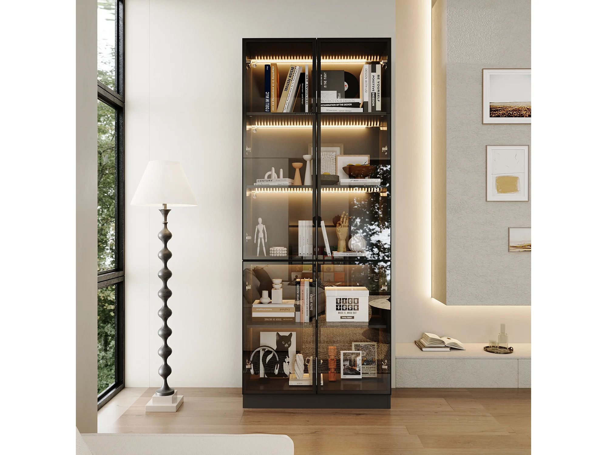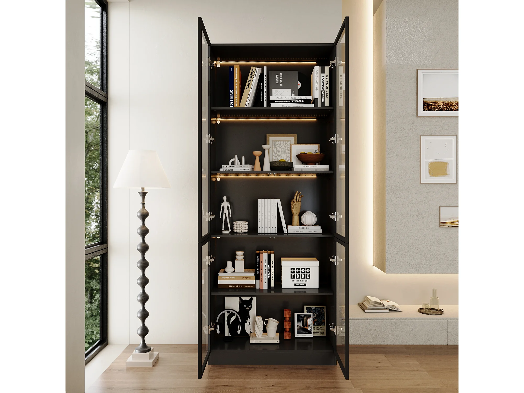 Vitrine avec LED 3 couleurs - 2 portes et à 5 niveaux - push to open, 80x36x200cm, Noir