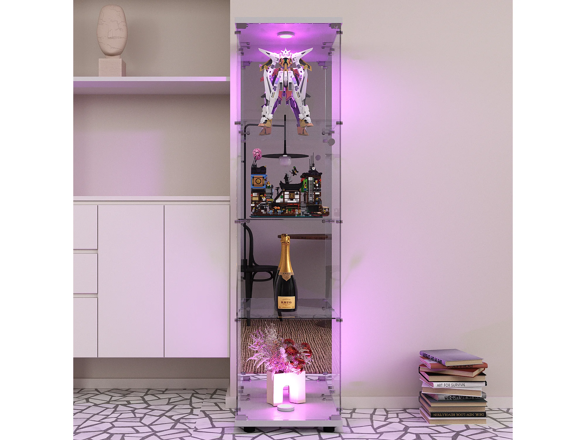 Vitrine vitrée - meuble indépendant pour collections avec éclairage LED - 1 porte et 4 étagères - vitrine pour figurines