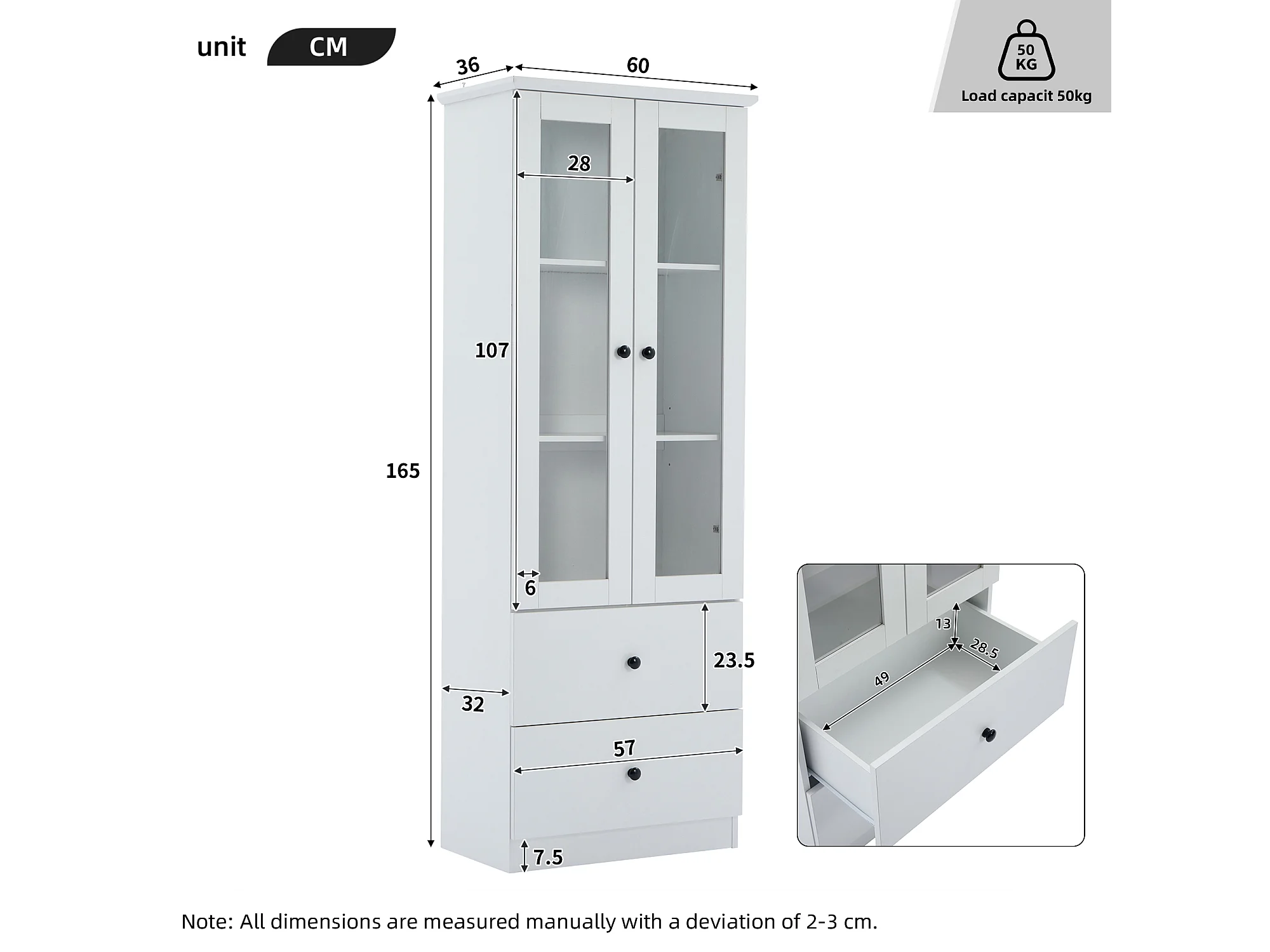 Vitrine en Verre, Meuble Vitrine avec LED, 2 Portes 2 Tiroirs Armoire Vitrine, 60x35.5x165cm, Blanc