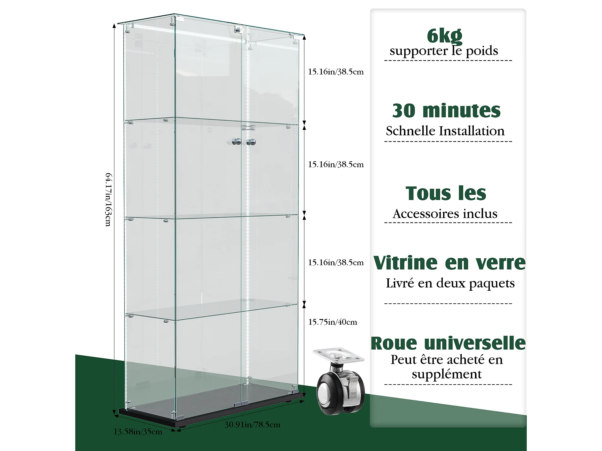 Vitrine en verre, Vitrine,Armoire de collection avec LED,4étagères et2 portes, 78x35 x163 cm, Noir