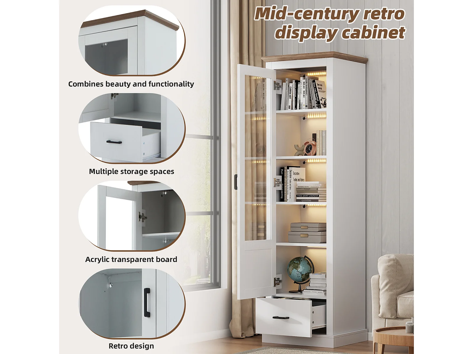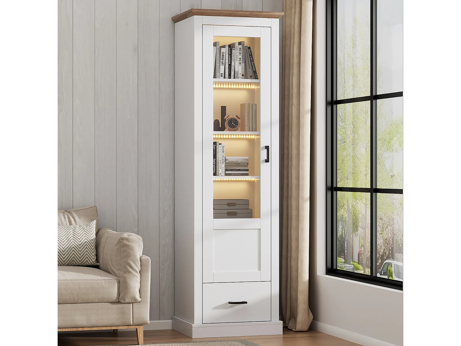 vitrine en Verre, Vitrine LED Blanche Mate, avec USB, Armoire Haute avec tiroir, 50 * 35 * 178 cm