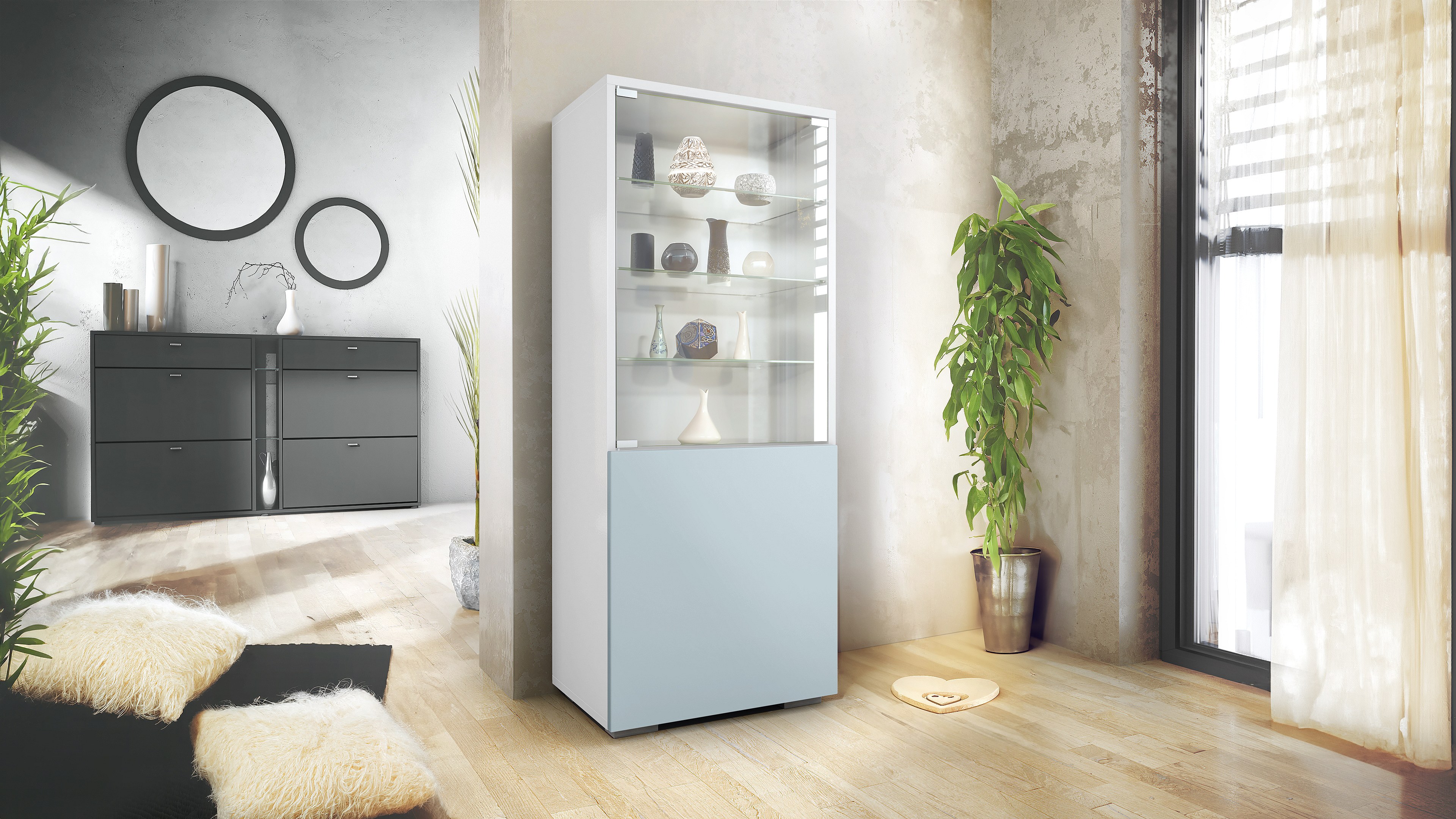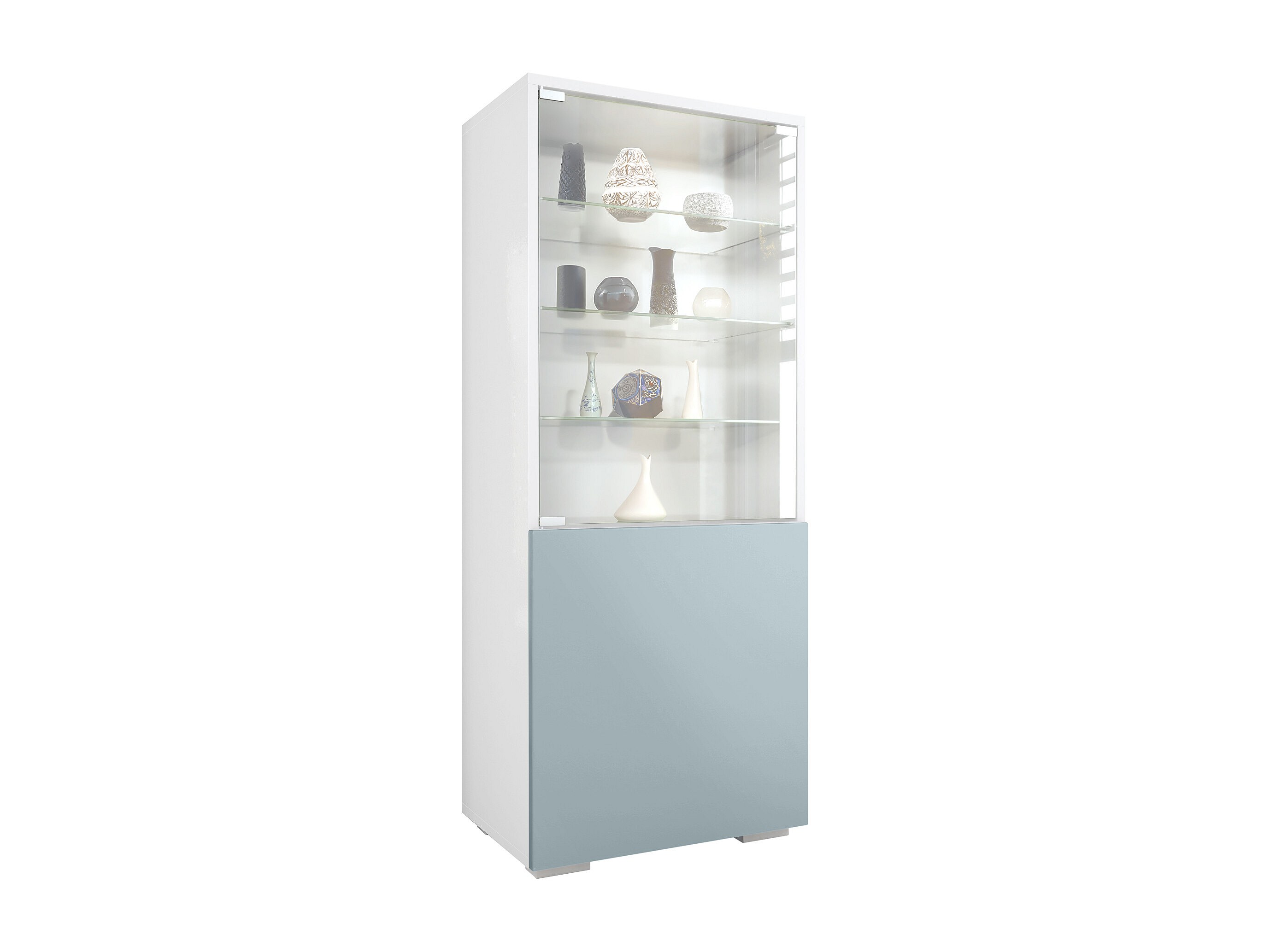 Vitrine Granada, Armoire Vitrée Made in Germany, avec Porte en Verre et Insert en Verre, blanc mat/denim mat (50 x 122,5 x 34,5 cm)