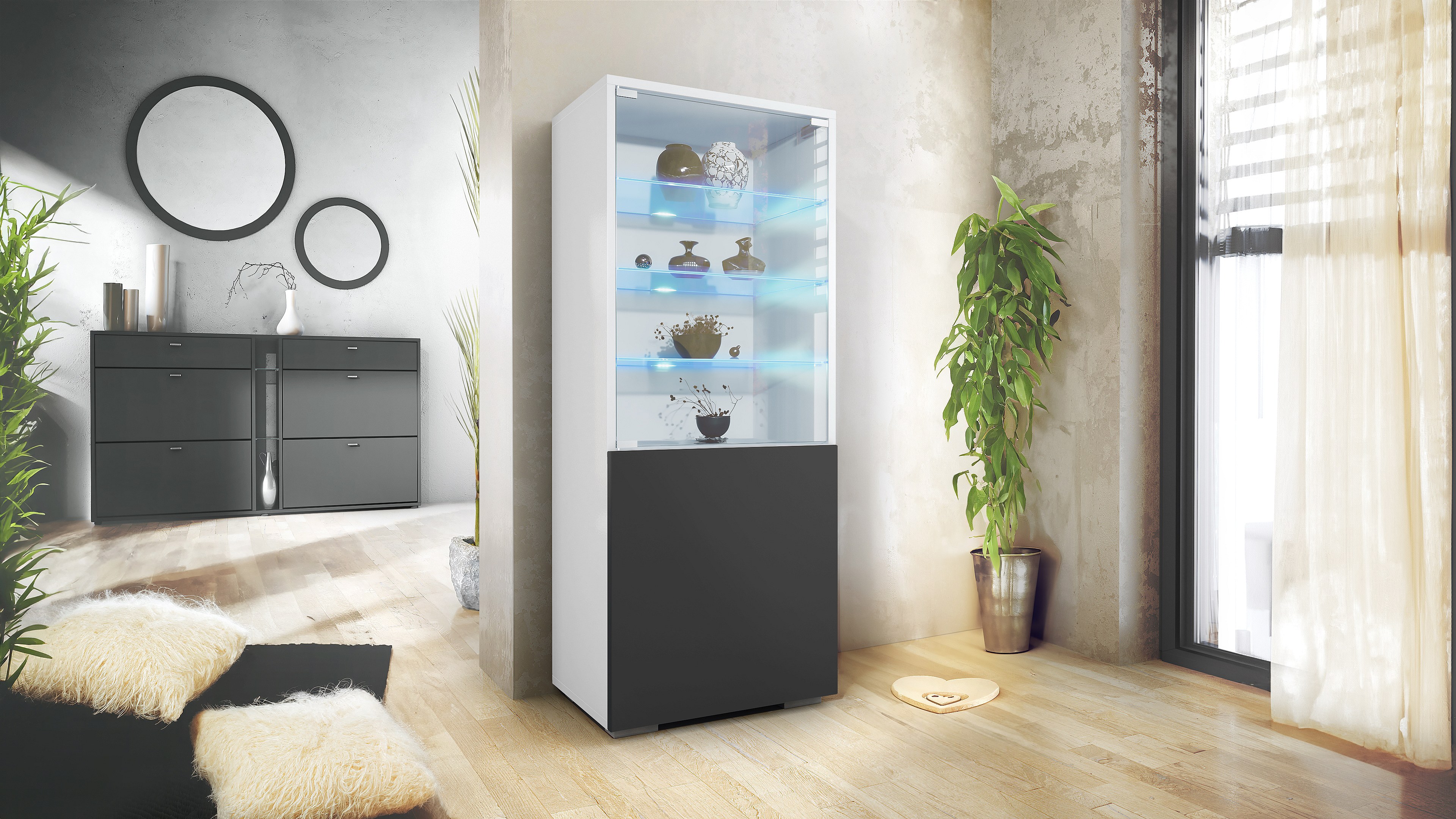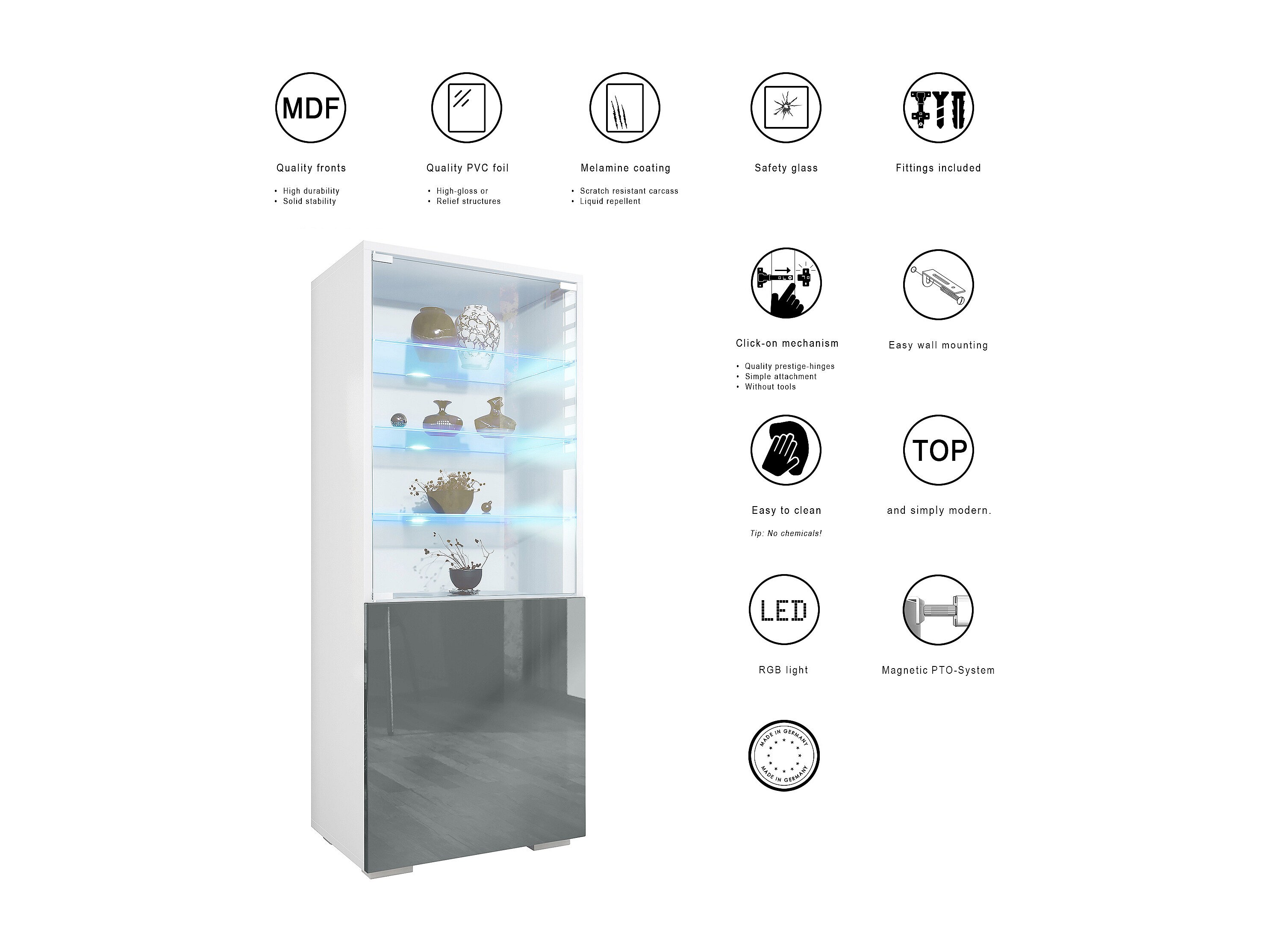 Vitrine Granada de , Armoire Vitrée Made in Germany avec Porte en Verre et Insert en Verre y compris LED, blanc mat/noir mat (50 x 122,5 x 34,5 cm)
