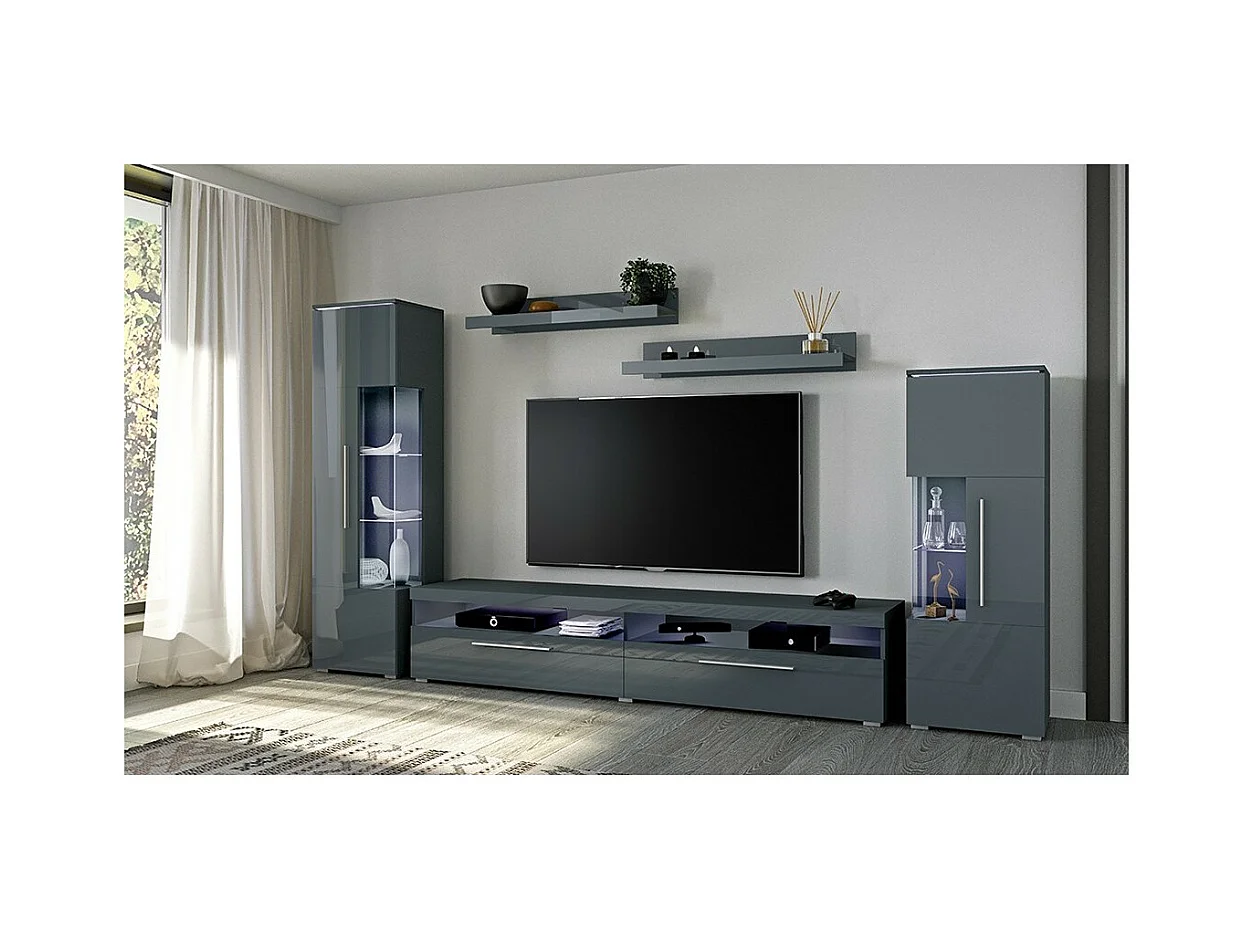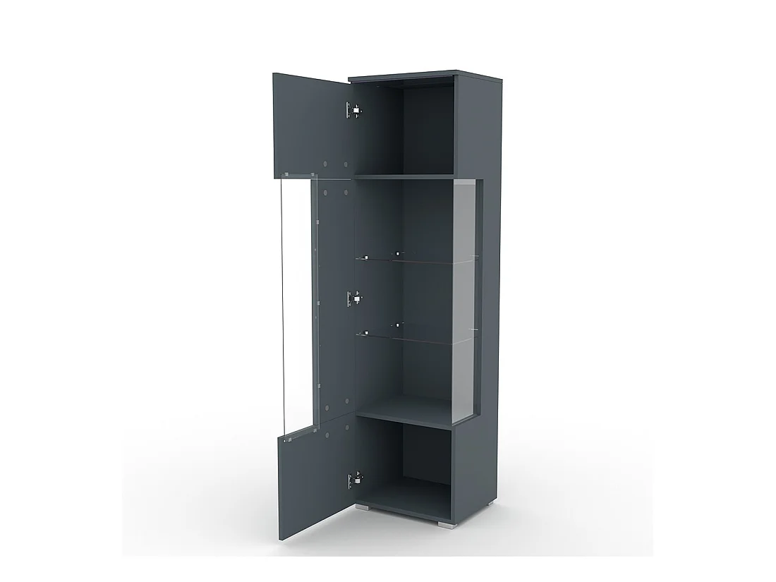 Vitrine haute design avec éclairage LED multicolore collection BOMBAY. Coloris gris brillant. Ouverture Gauche