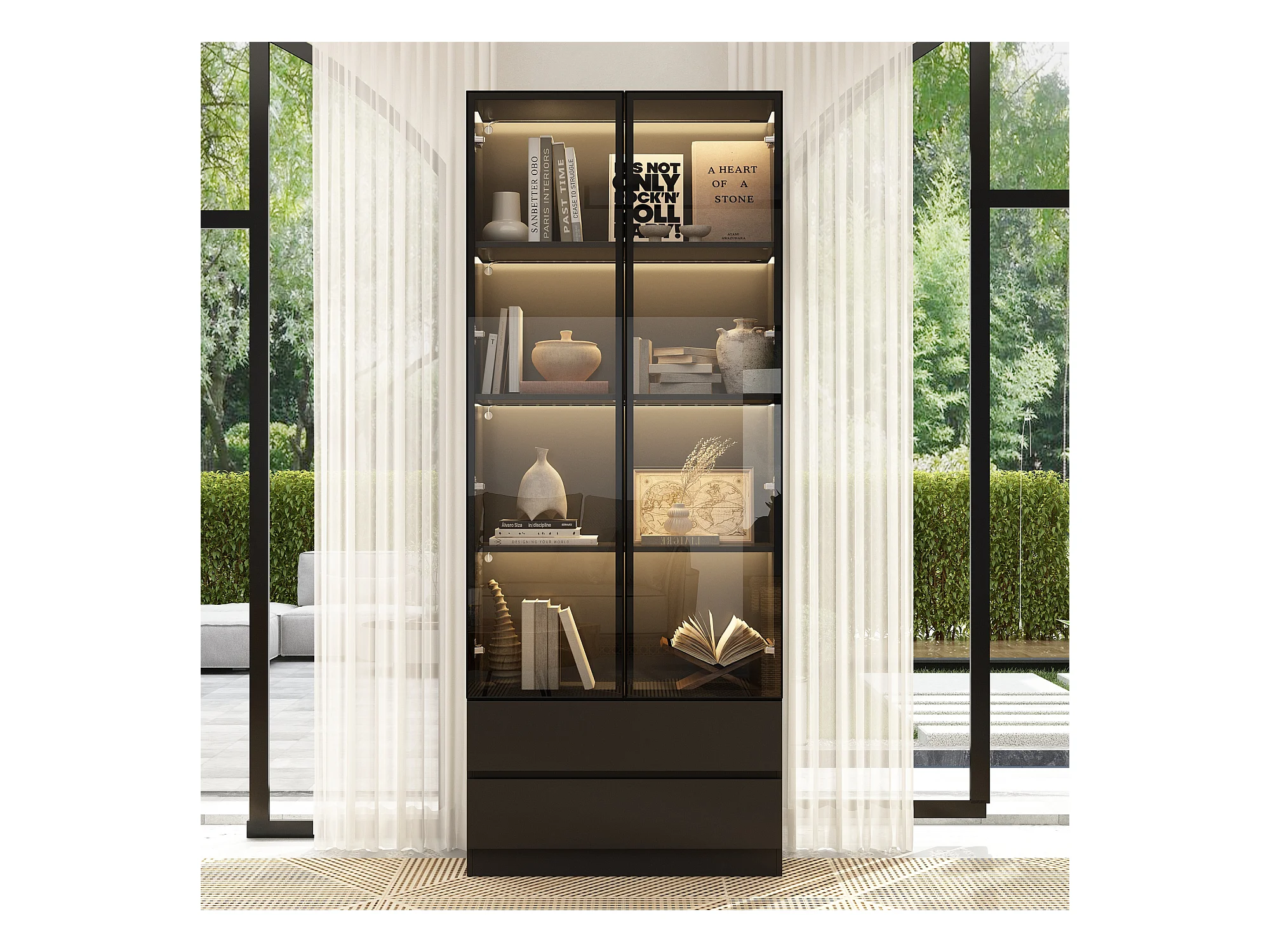 Vitrine LED avec Portes en verre trempé Bibliothèque 6 étagères 2 portes 2 tiroirs Buffet haut Salon Chambre Blanc 80x36x200cm