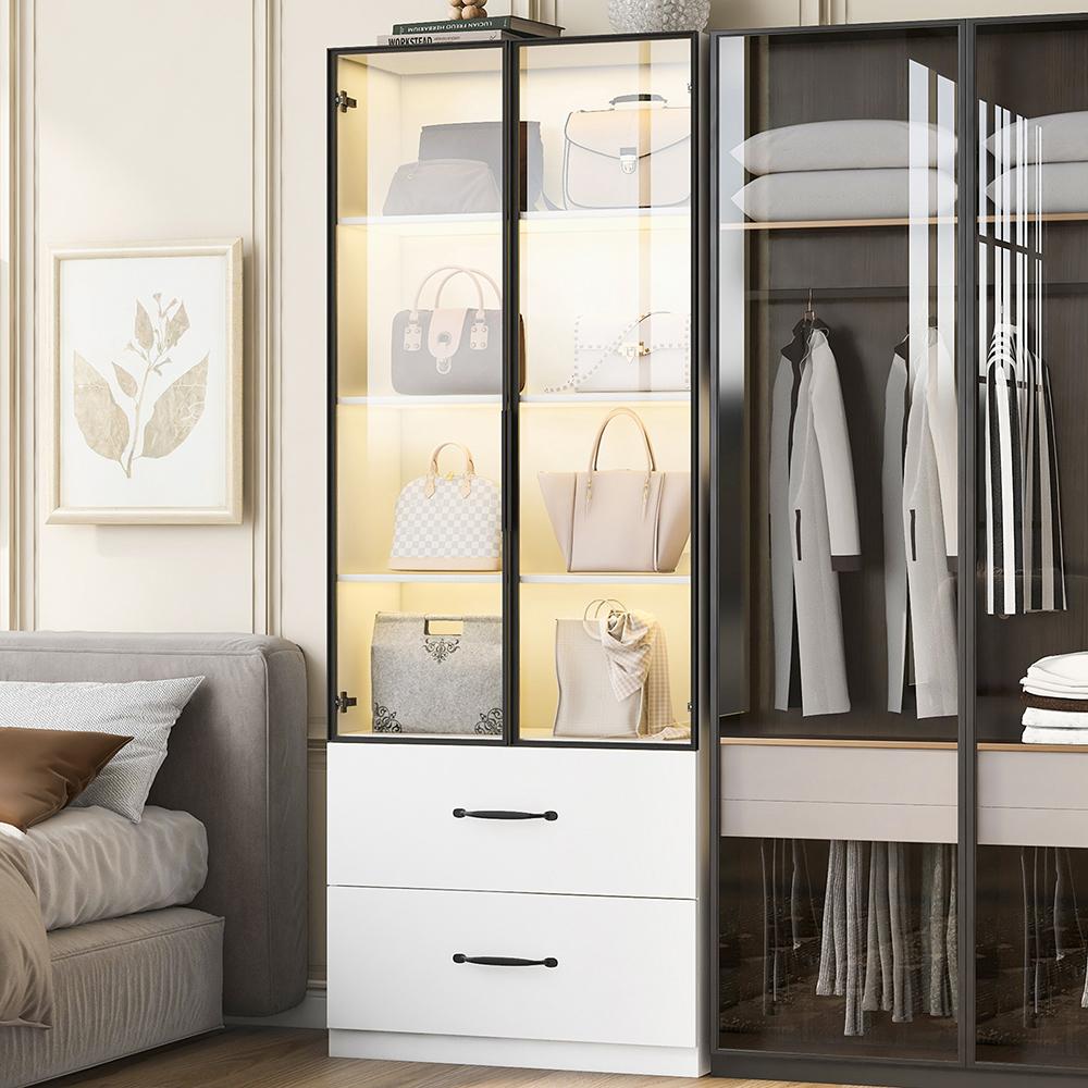 Vitrine LED verre bibliothèque armoire multifonction éclairage tiroirs aluminium portes verre trempé charnières douces LED multicolores