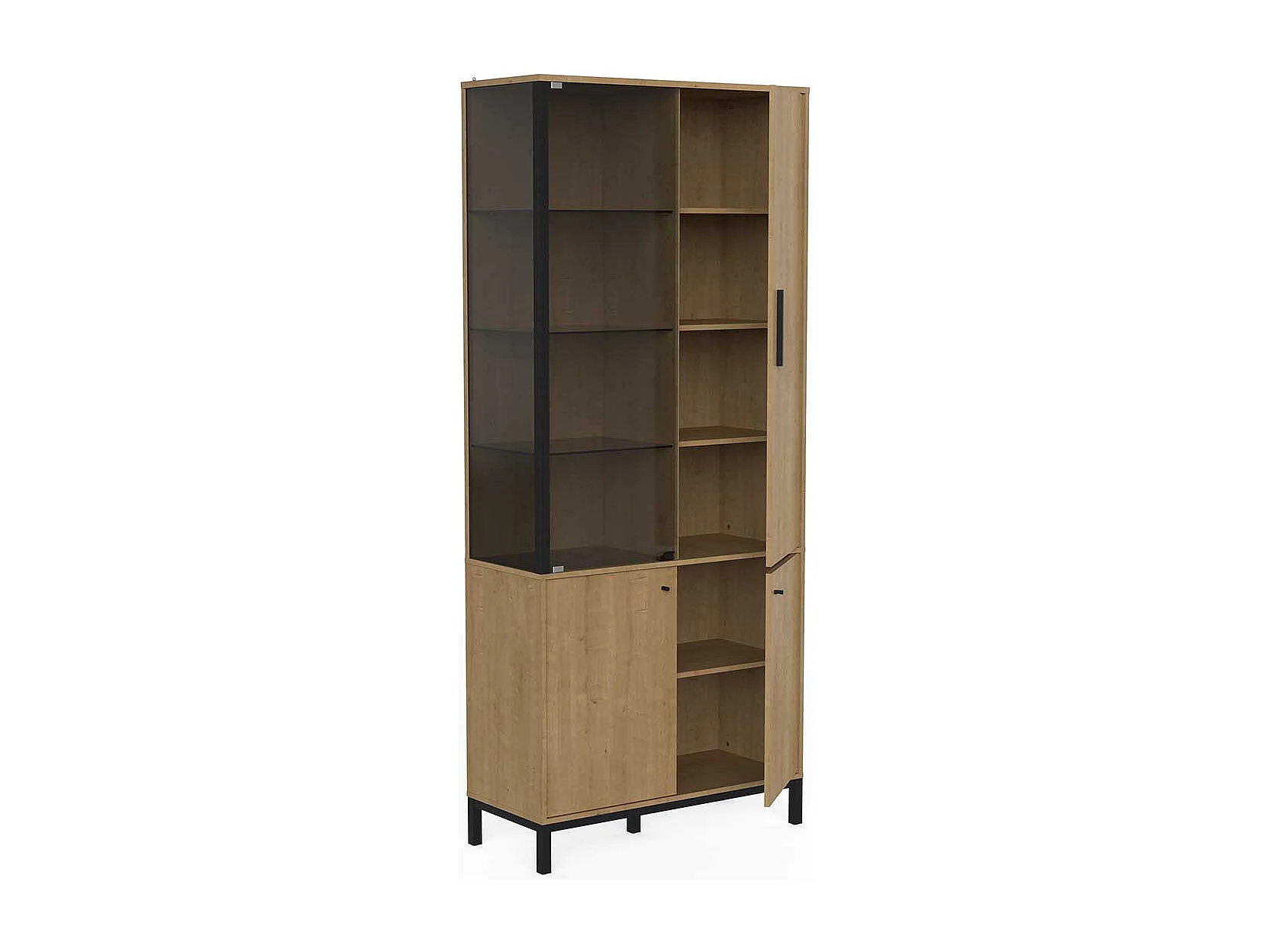 Vitrine meuble de rangement 4 portes couleur chêne / noir - Largeur 93,4 x Profondeur 39,6 x Hauteur 186,1 cm