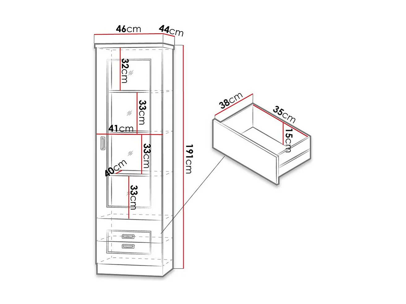 Étagère Lircava 108, Avec tiroirs|Avec des portes|Fermé, Verre|Stratifié, 191x46x44cm