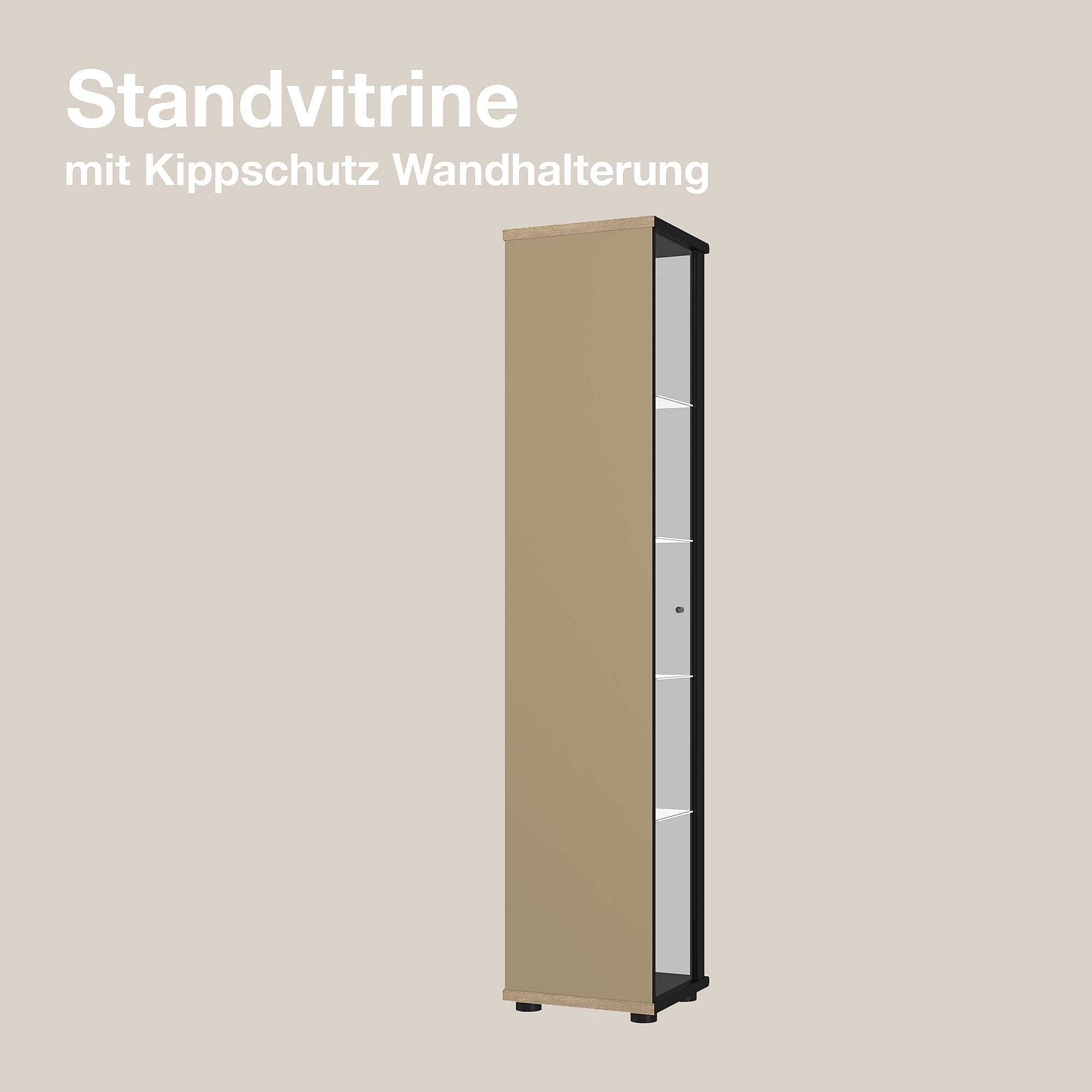 Vitrine sur pied avec 1 porte, 4 étagères en verre réglables en hauteur & miroir - Avec éclairage LED - 176x37x33 cm - Noir