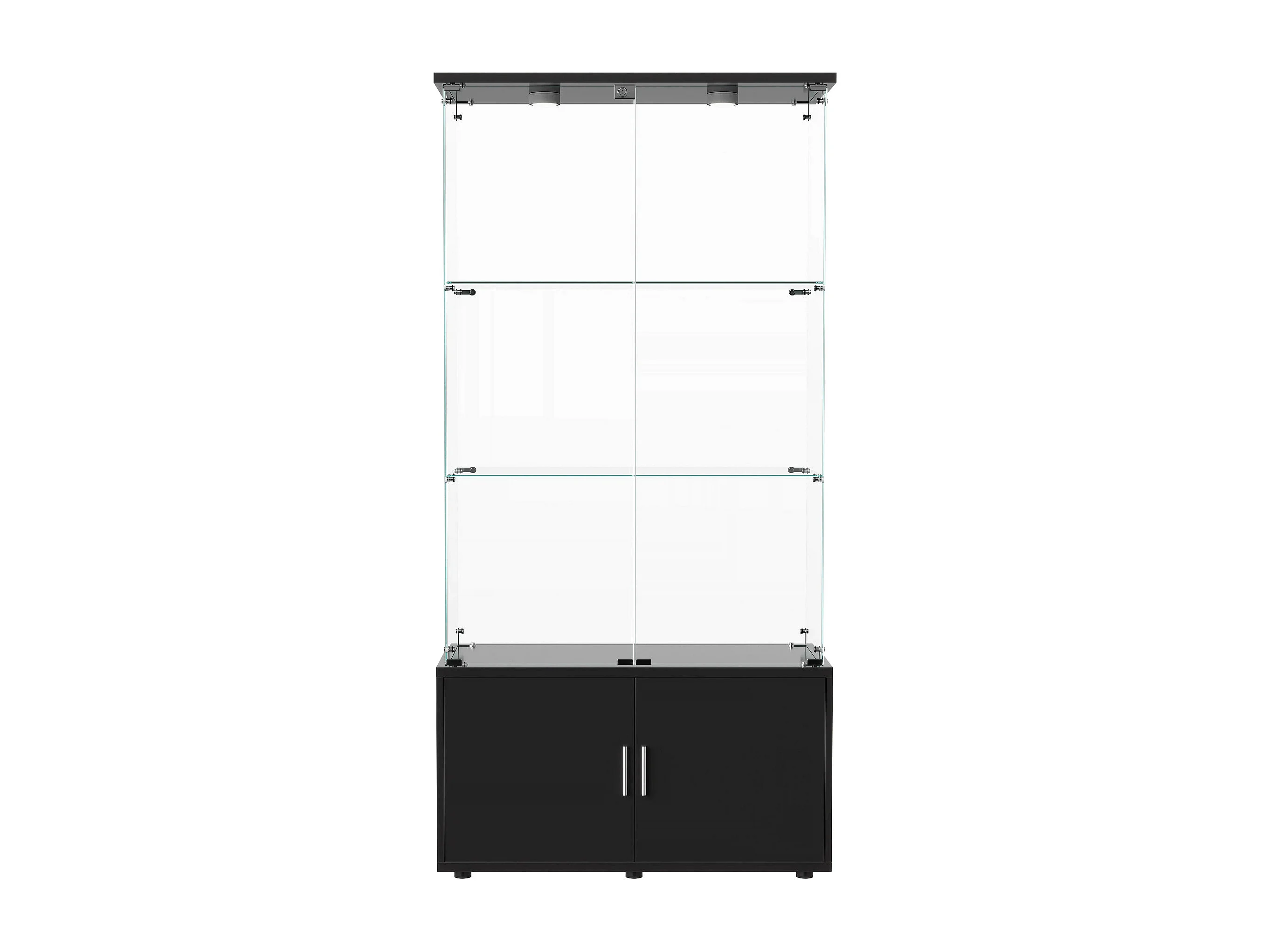 Vitrine sur pied avec 4 portes, 3 plateaux verre transparent avec serrure, verre trempé et boir, Multi - usage - Avec éclairage LED - 78x35x164 cm - Noir