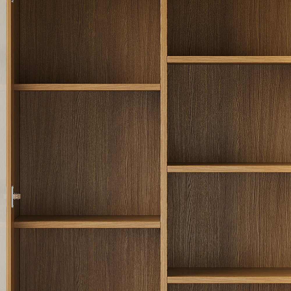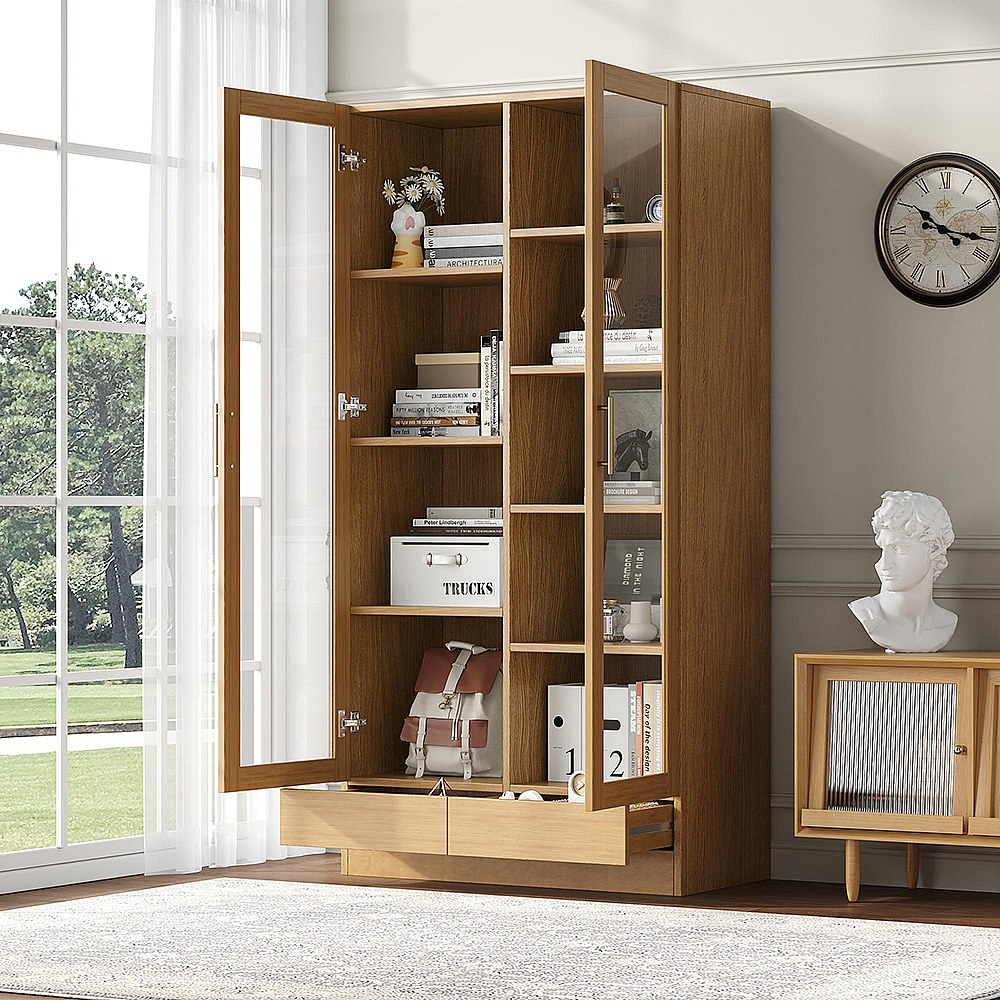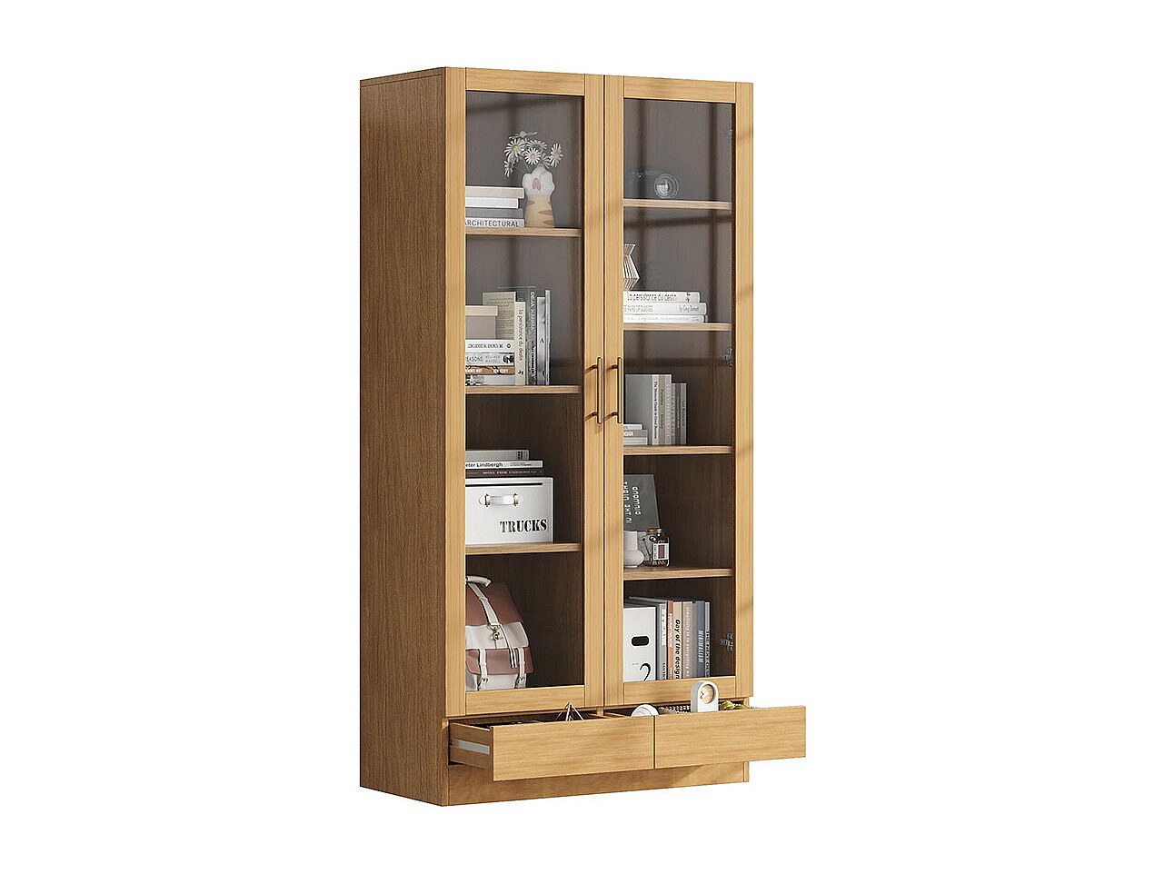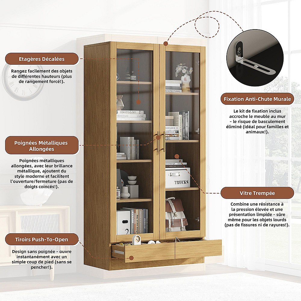 Vitrine verre armoire bureau bibliothèque étagères décalées tiroirs ouverture pression bois