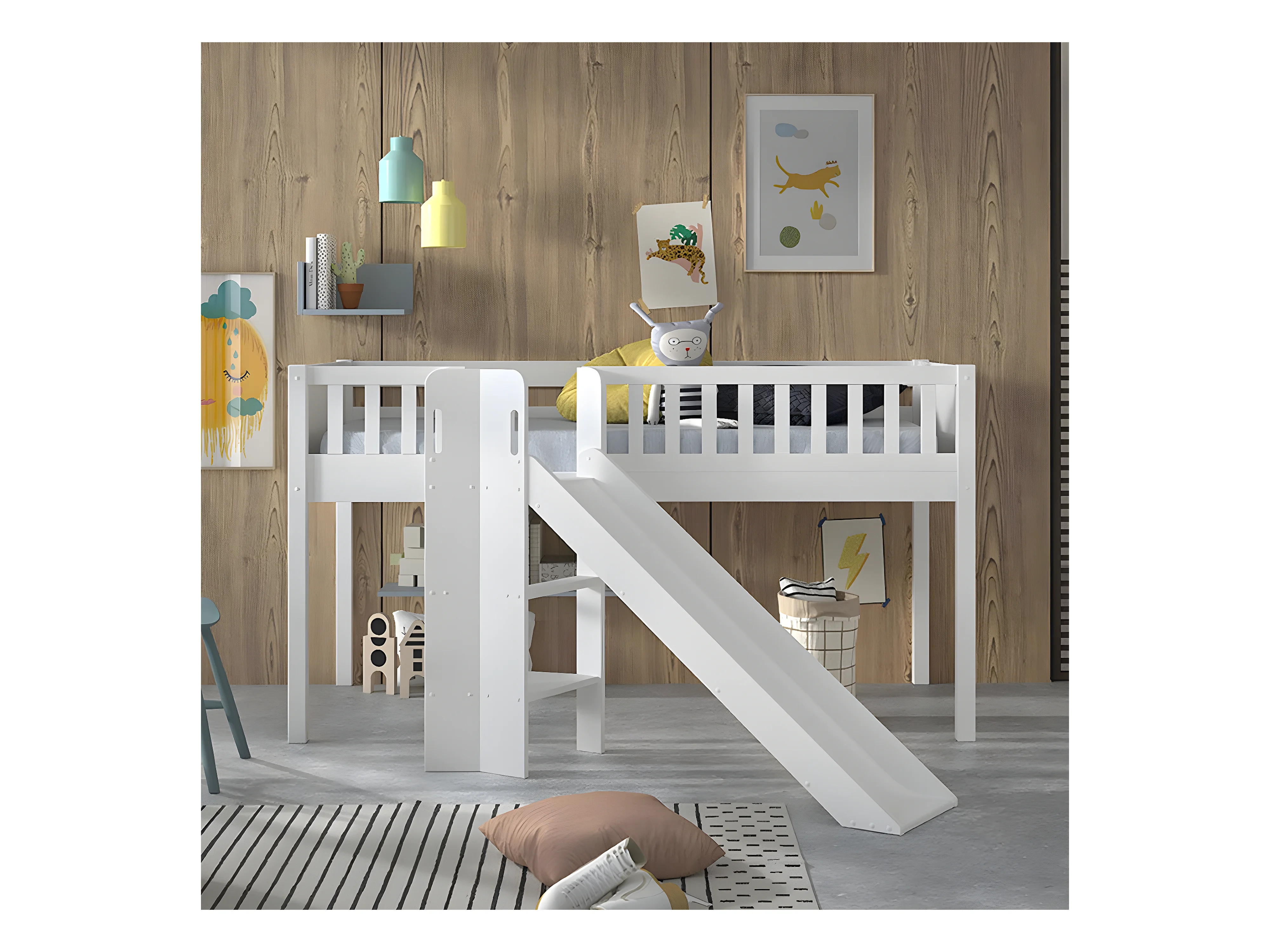 VIVIEN - Lit Mi-Haut en Pin Laqué Blanc 90x200cm avec Tobogan