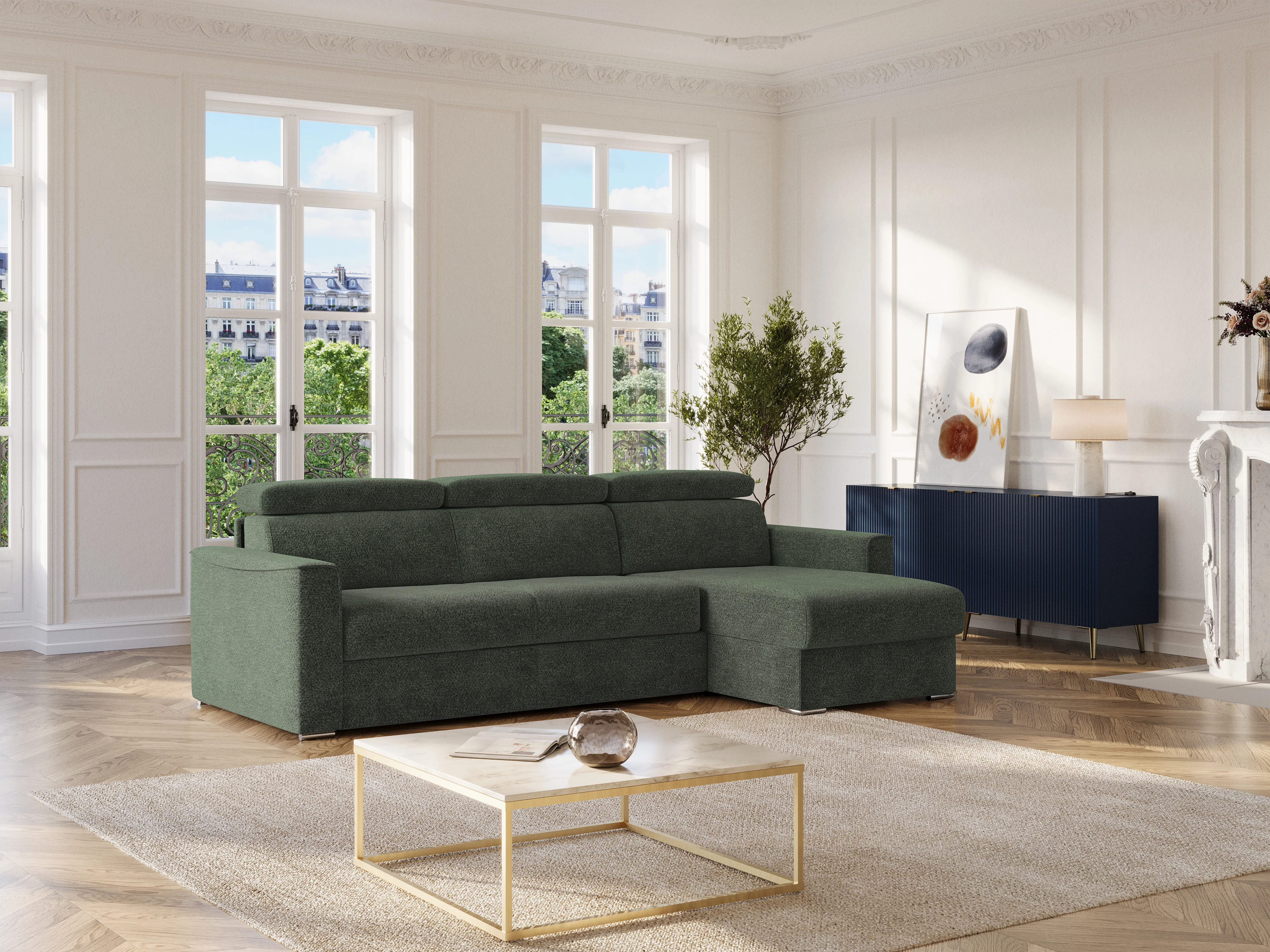 Canapé d'angle réversible convertible express en tissu chenille vert - Couchage 160 cm - Matelas 22 cm mémoire de forme VIZIR
