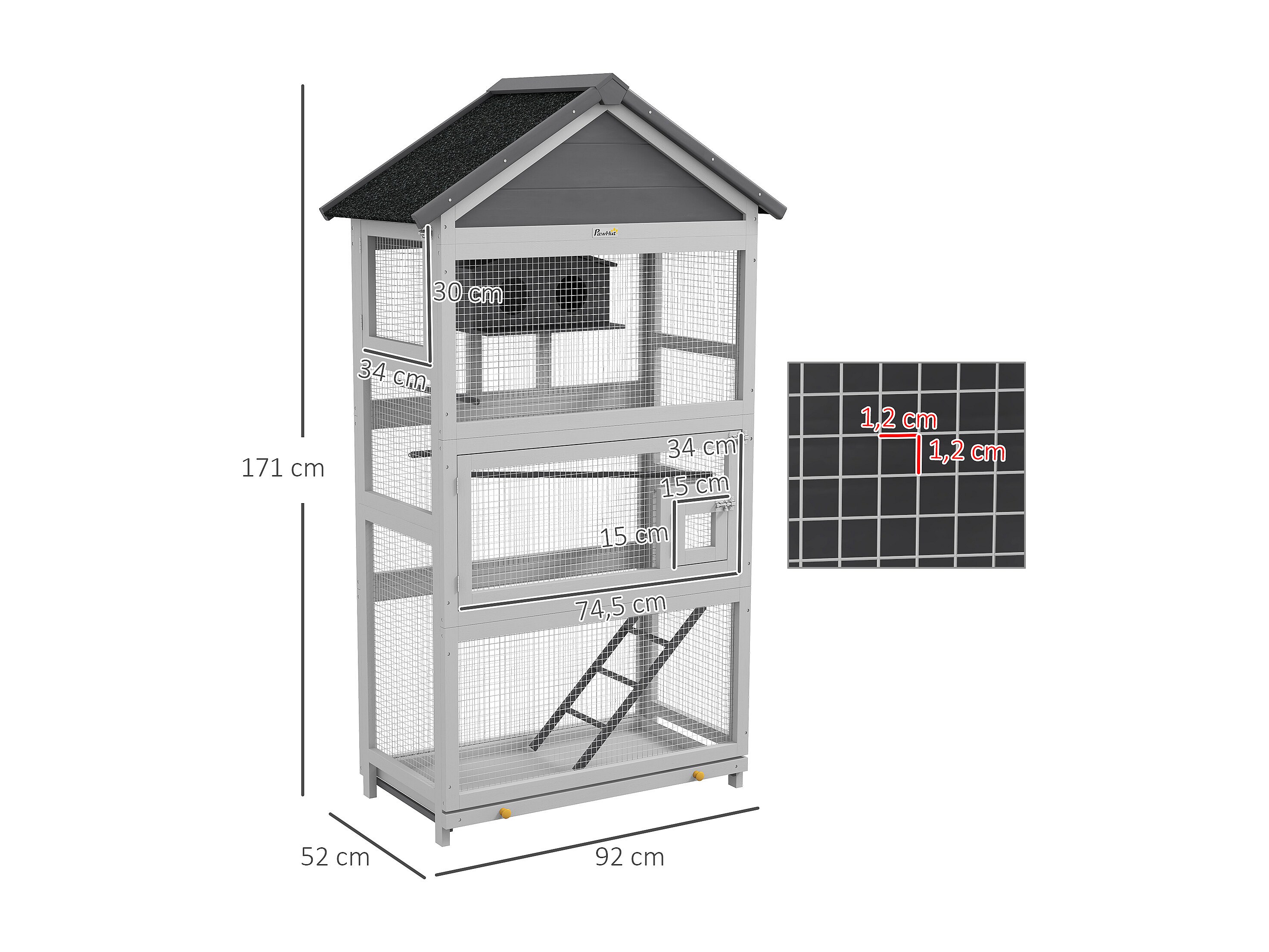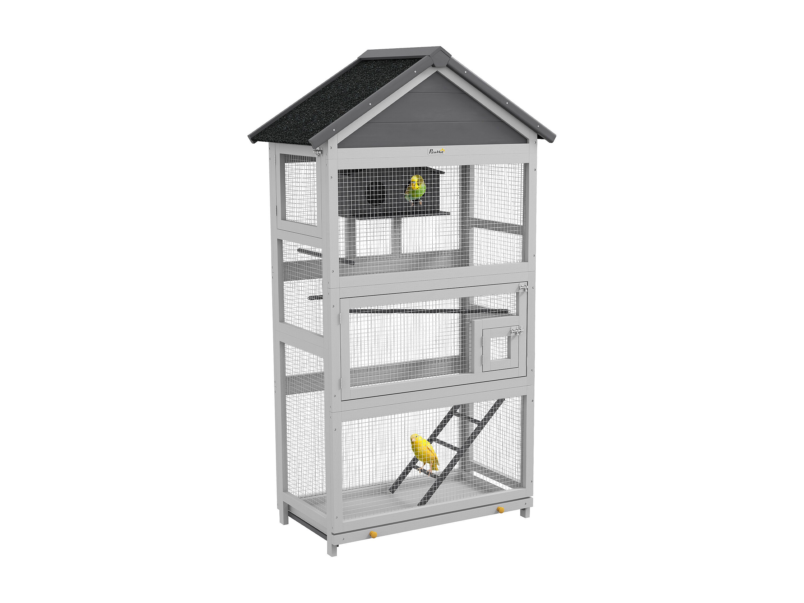 Volière grande cage à oiseaux en bois - 3 portes, toit bitumé double pente, échelle, perchoirs, nichoir, plateau - gris