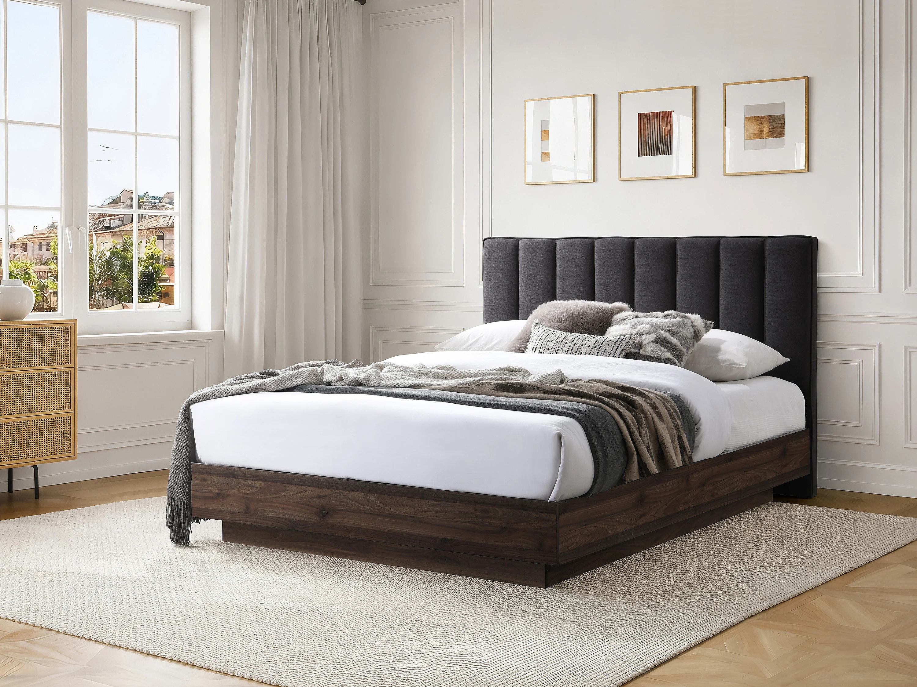 Lit 160 x 200 cm avec tête de lit en tissu – Gris et naturel foncé – VONYLA