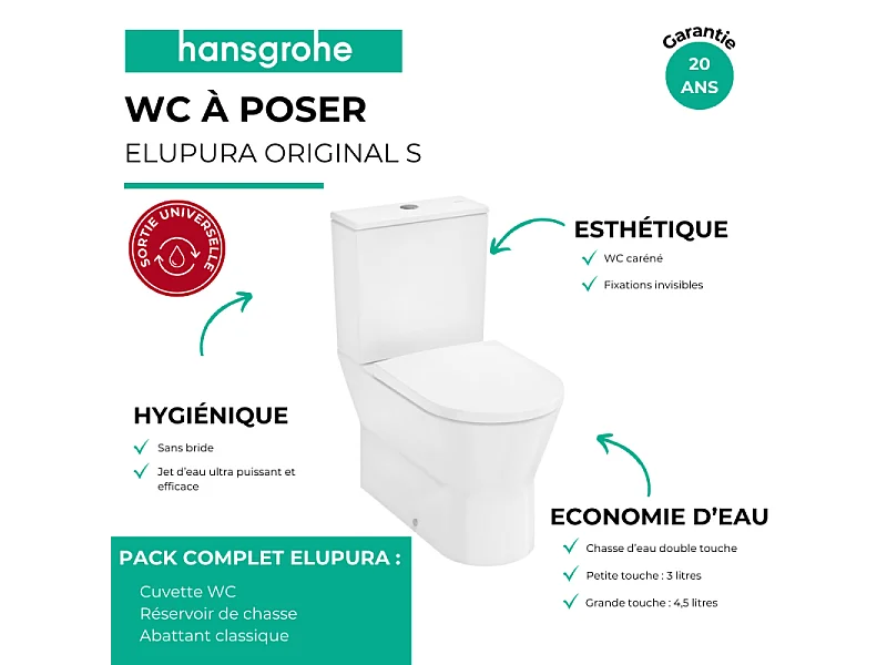 WC à poser sans bride sortie universelle HANSGROHE Elupura Original S avec abattant