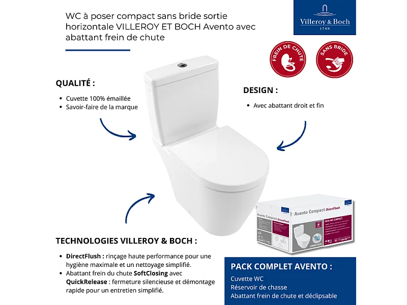 WC à poser compact sans bride sortie horizontale VILLEROY ET BOCH Avento avec abattant frein de chute + Nettoyant