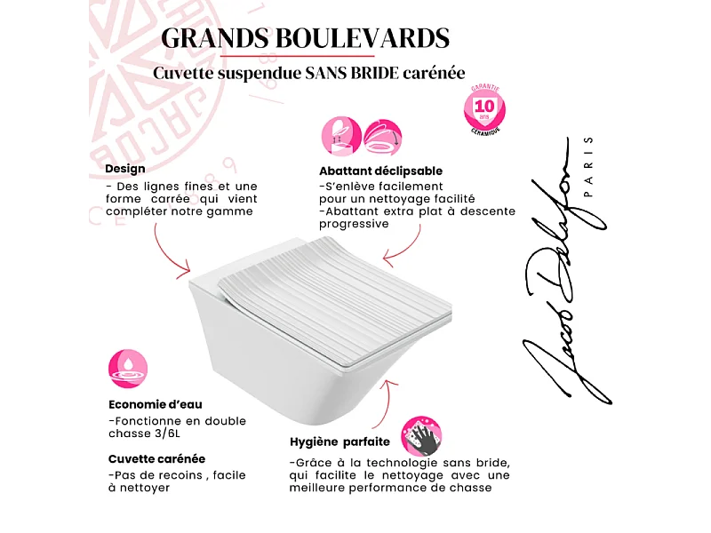 WC suspendu sans bride JACOB DELAFON Grands Boulevards caréné + abattant