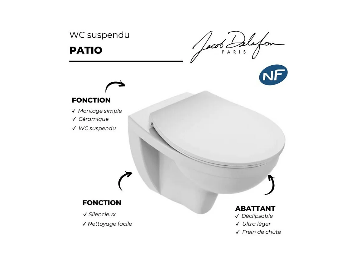 WC suspendu sans bride JACOB DELAFON Patio + abattant extra plat