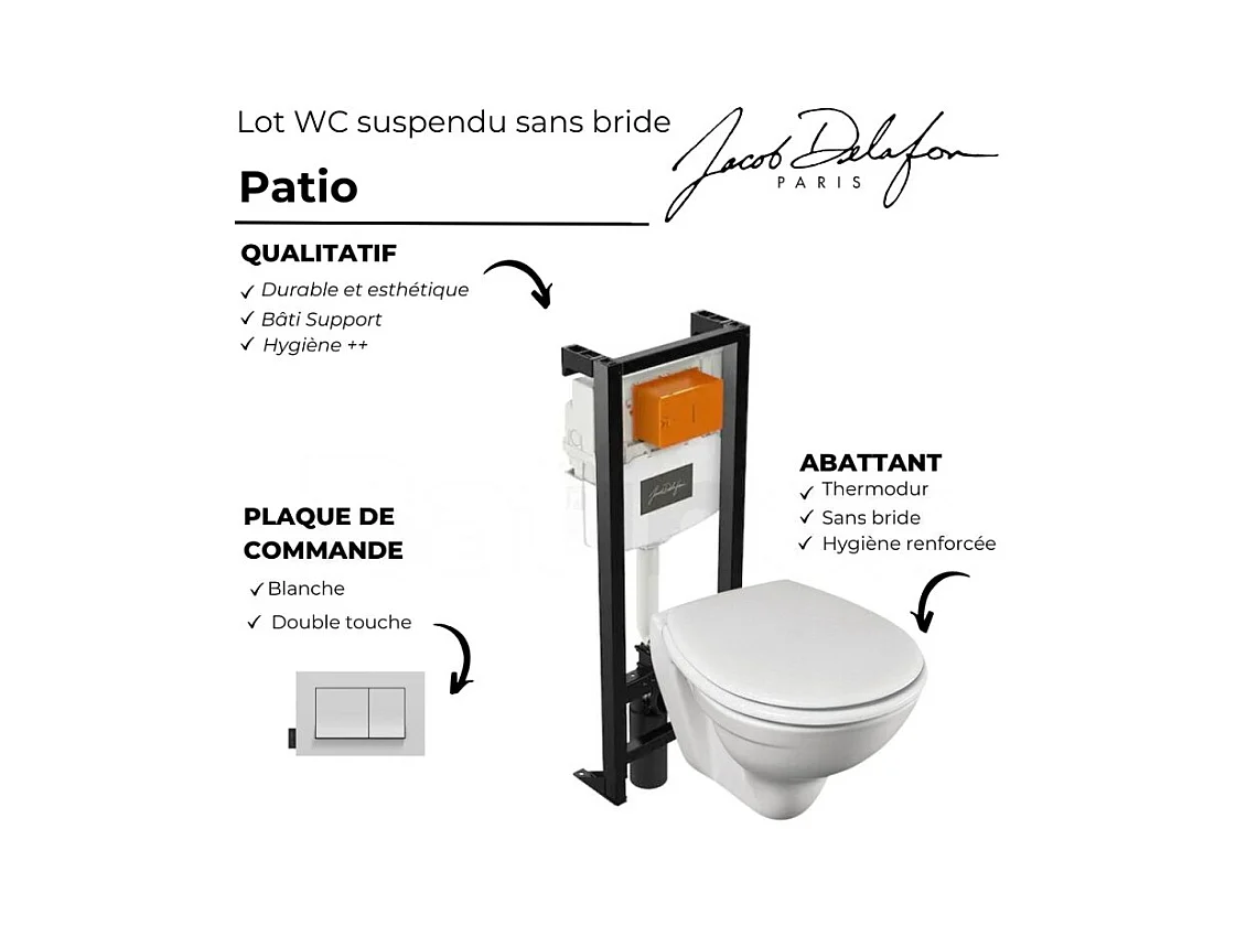WC suspendu sans bride JACOB DELAFON Patio + bâti-support + abattant