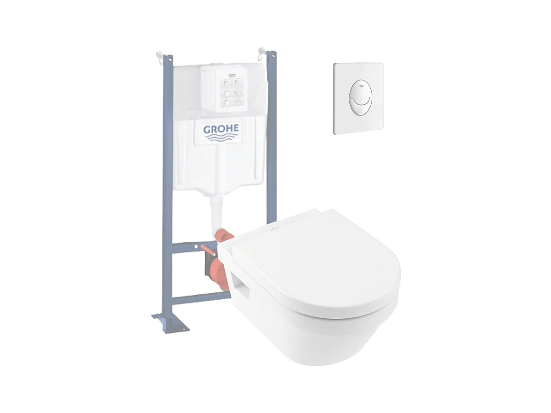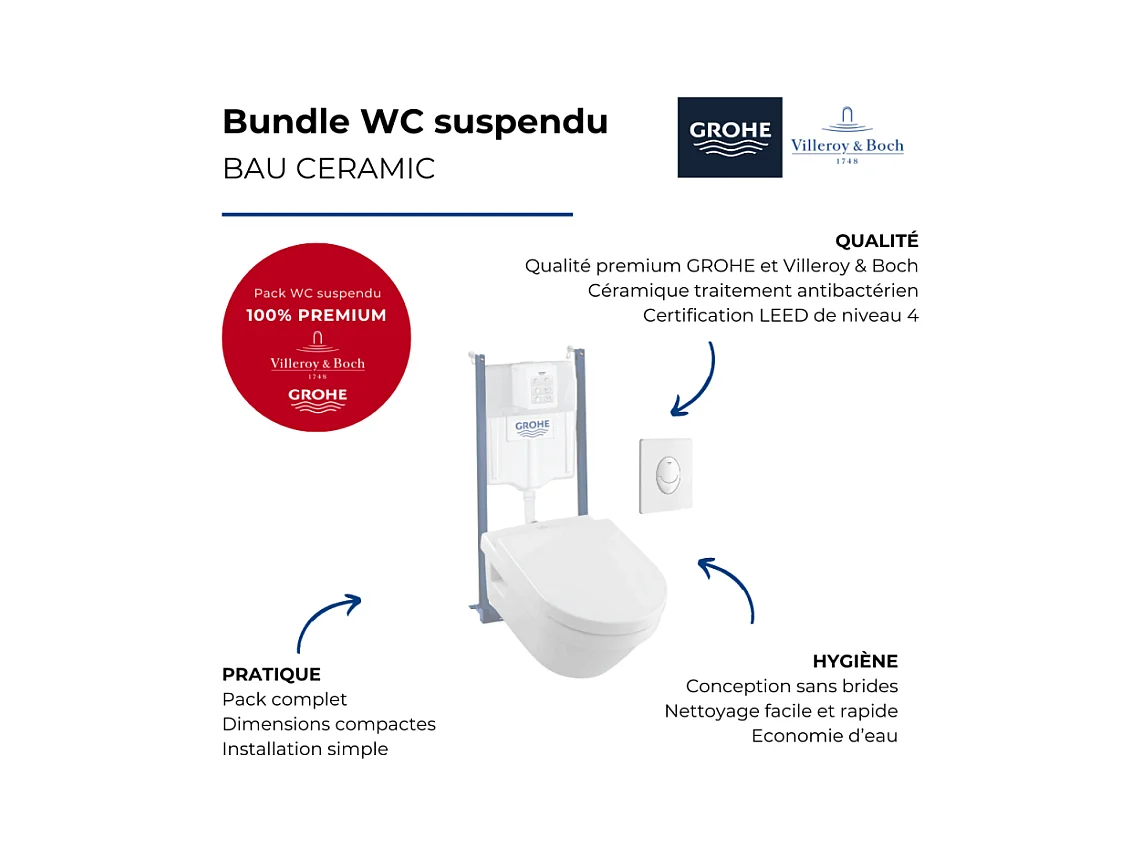WC suspendu sans bride VILLEROY ET BOCH Architectura + abattant + bati support GROHE + plaque de commande blanche