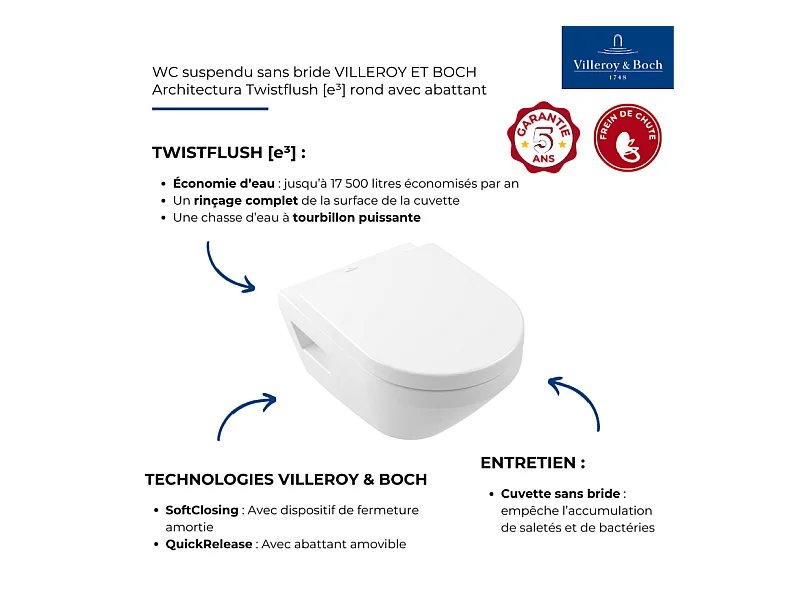 WC suspendu sans bride VILLEROY ET BOCH Architectura Twistflush rond avec abattant