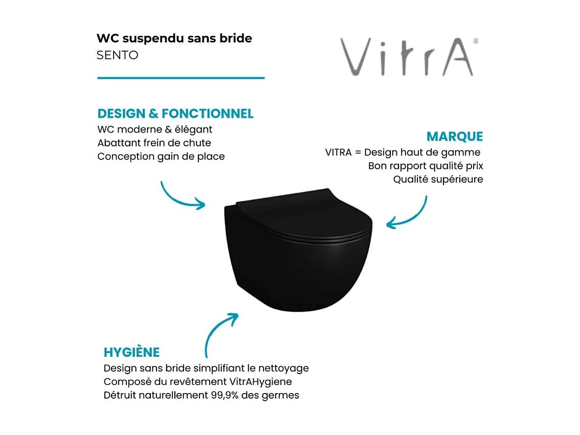 WC suspendu sans bride VITRA Sento noir mat + abattant