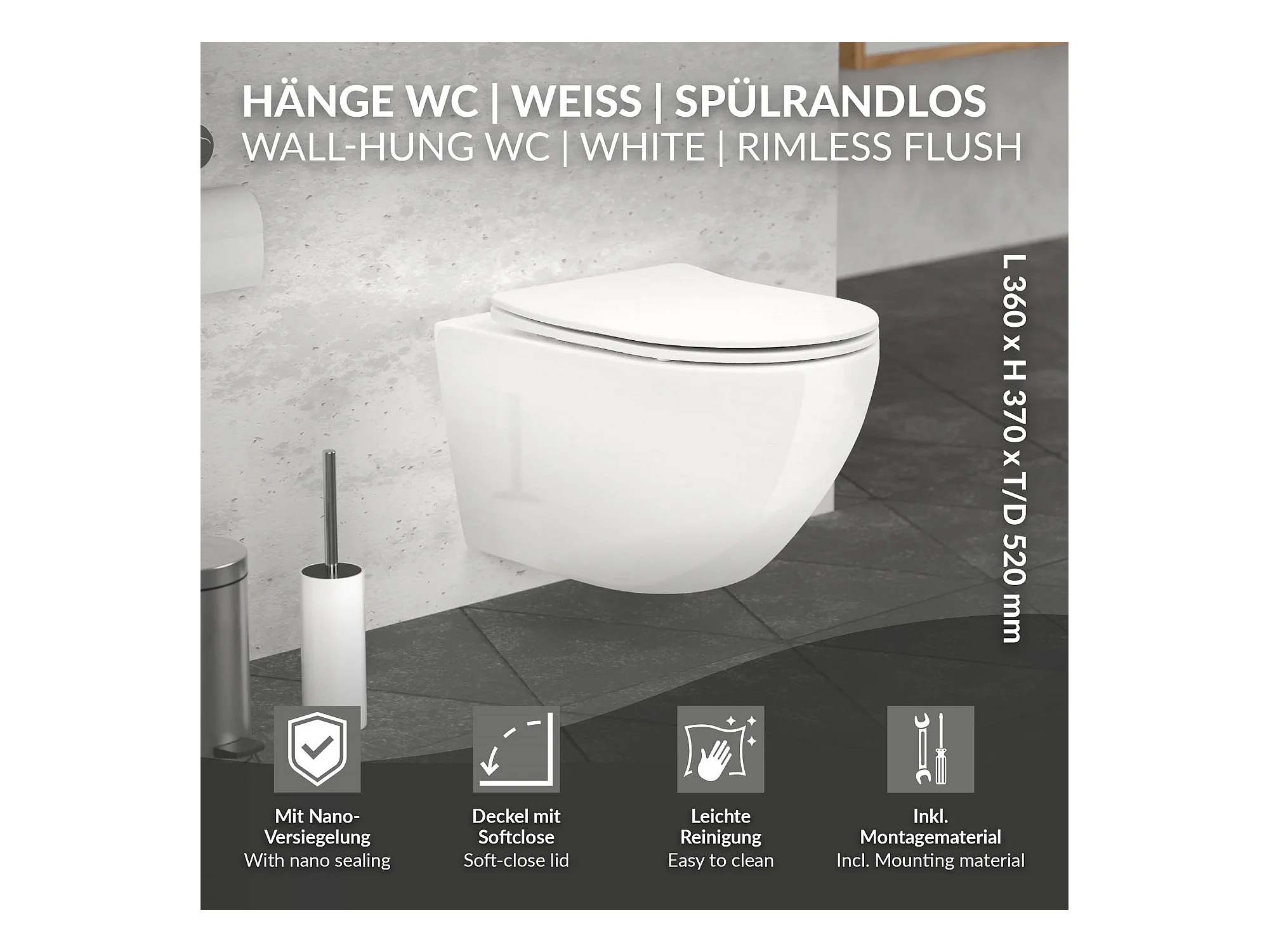 ECD Germany WC Suspendu sans Rebord en Céramique Blanc, Revêtement Nano, Toilette Murale Suspendue Long 52cm, avec Siège Softclose Silencieuse, Chasse d'Eau
