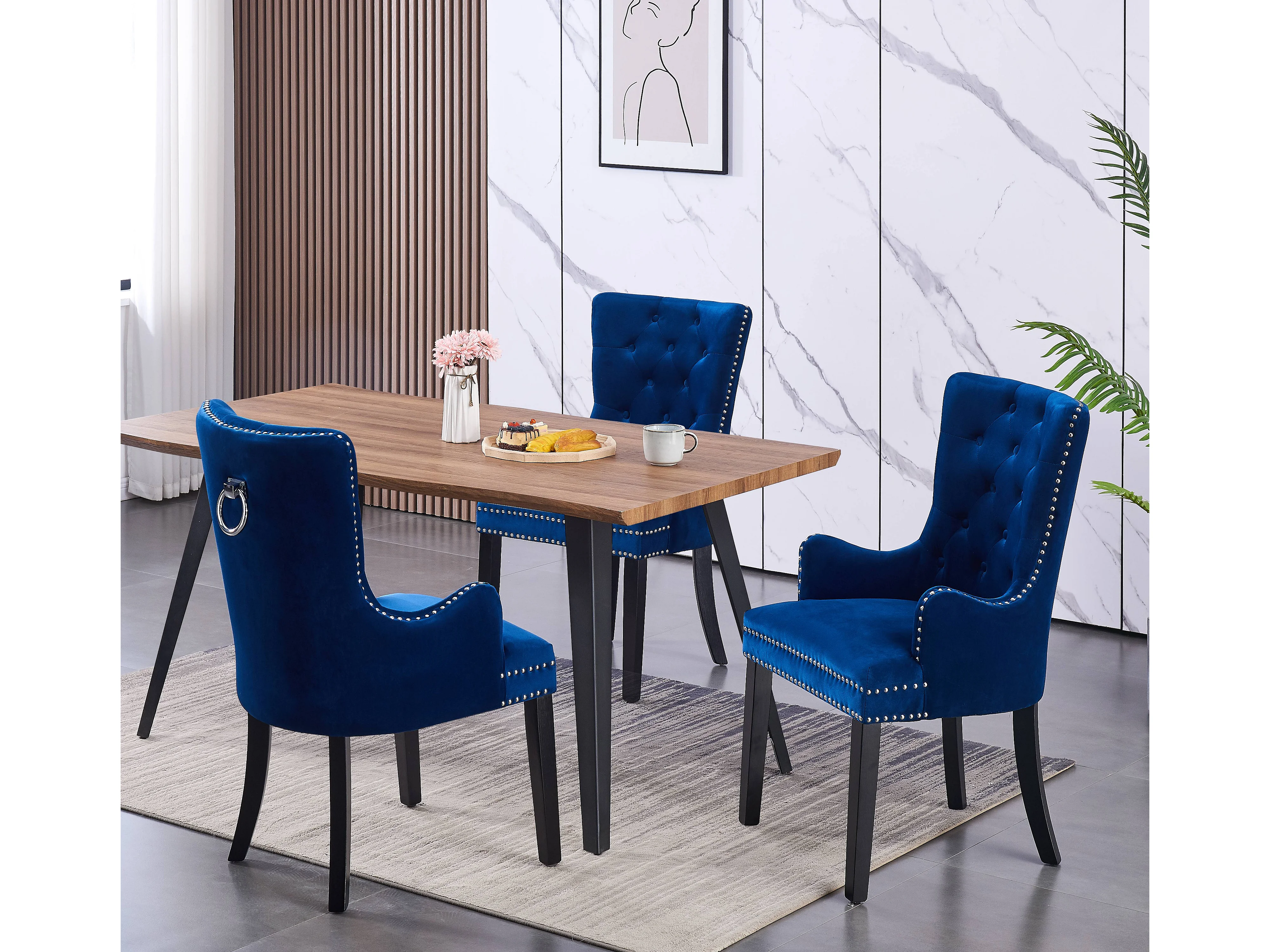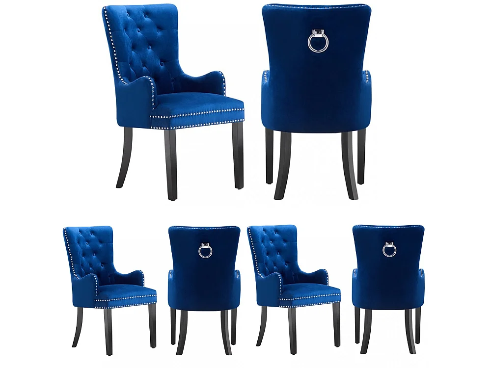 Windsor - Lot de 6 Chaises Capitonnée en Velours - Avec Accoudoirs - Pieds en Bois - Bleu