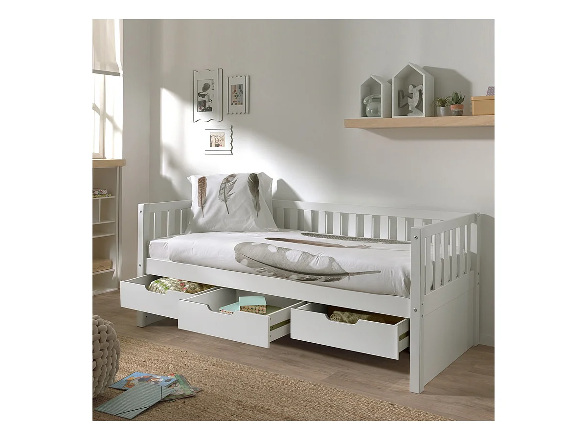 YAX - Lit Banquette 90x200cm à Tiroirs en Pin Laqué Blanc