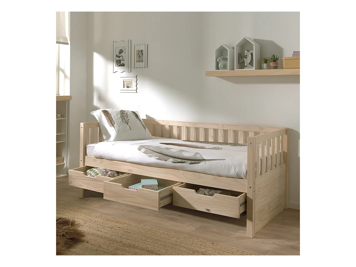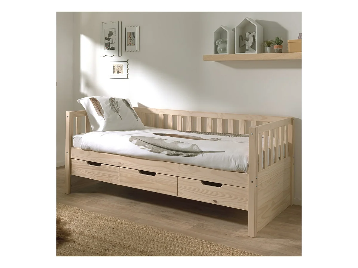 YAX - Lit Banquette 90x200cm à Tiroirs en Pin Naturel