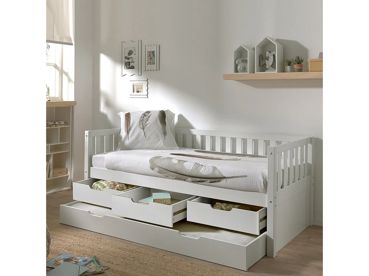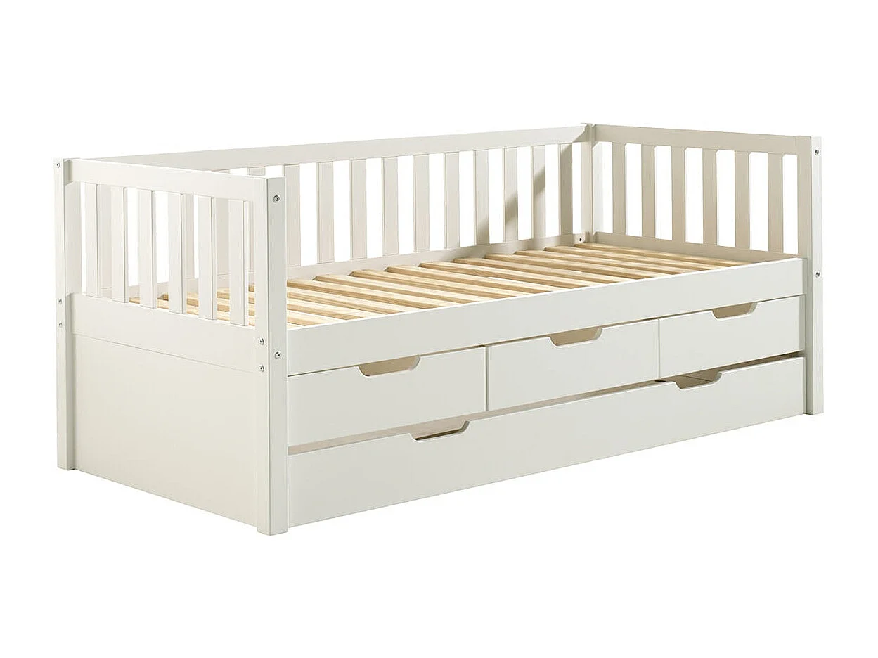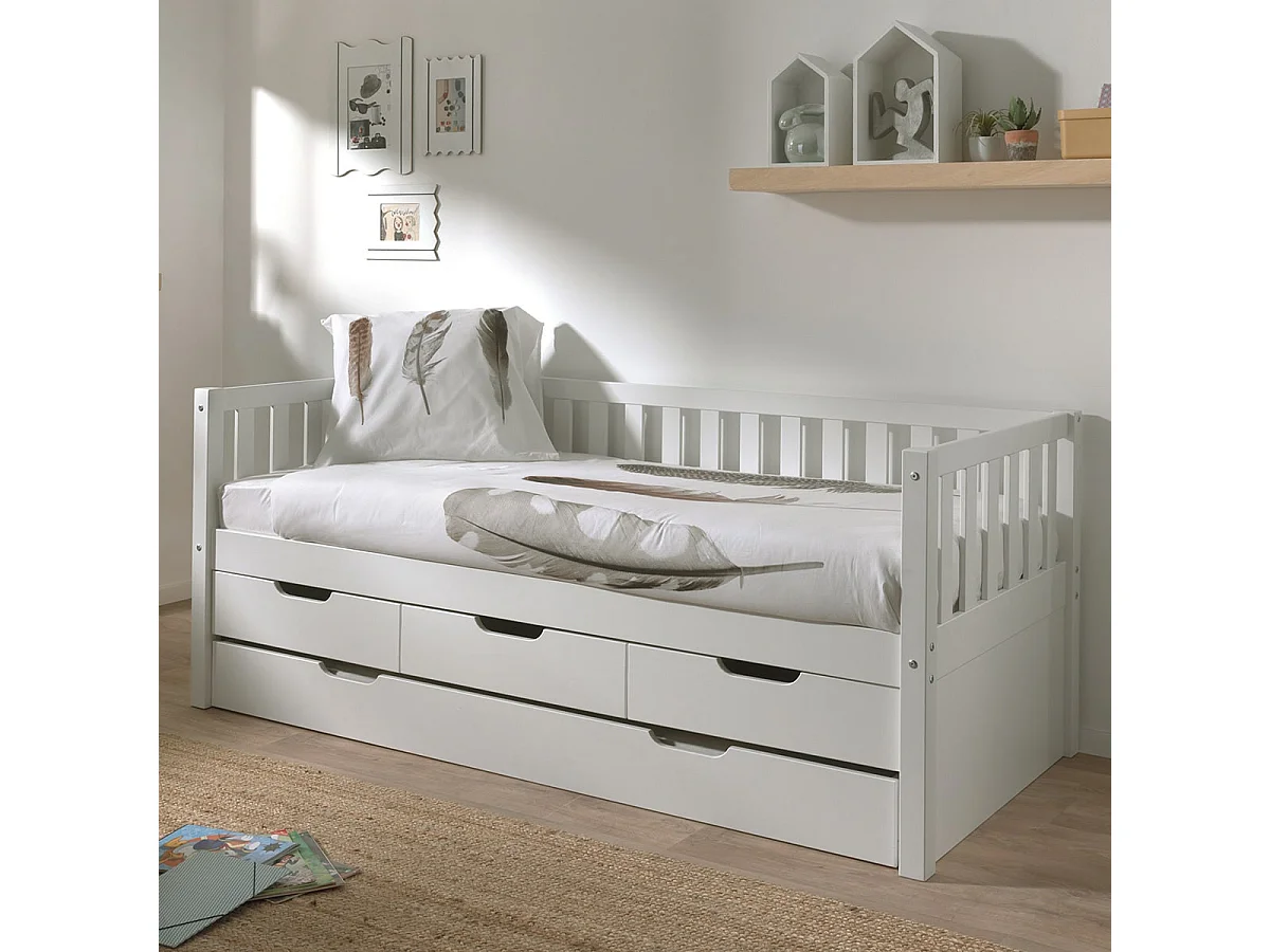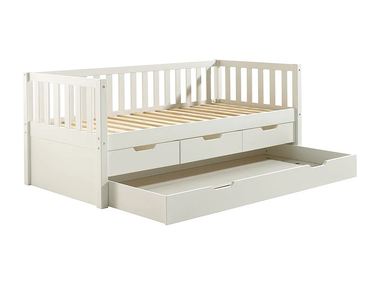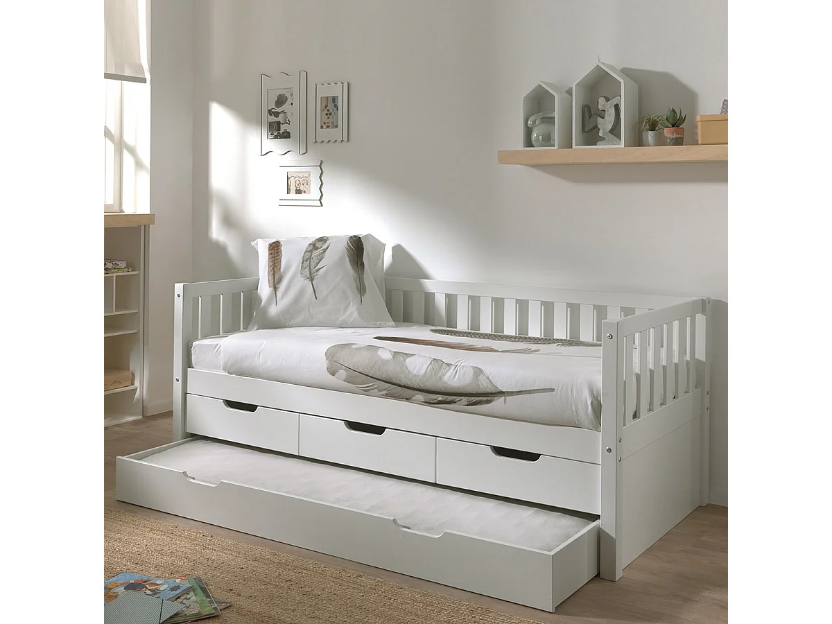 YAX - Lit Gigogne 90x200cm à Tiroirs en Pin Laqué Blanc