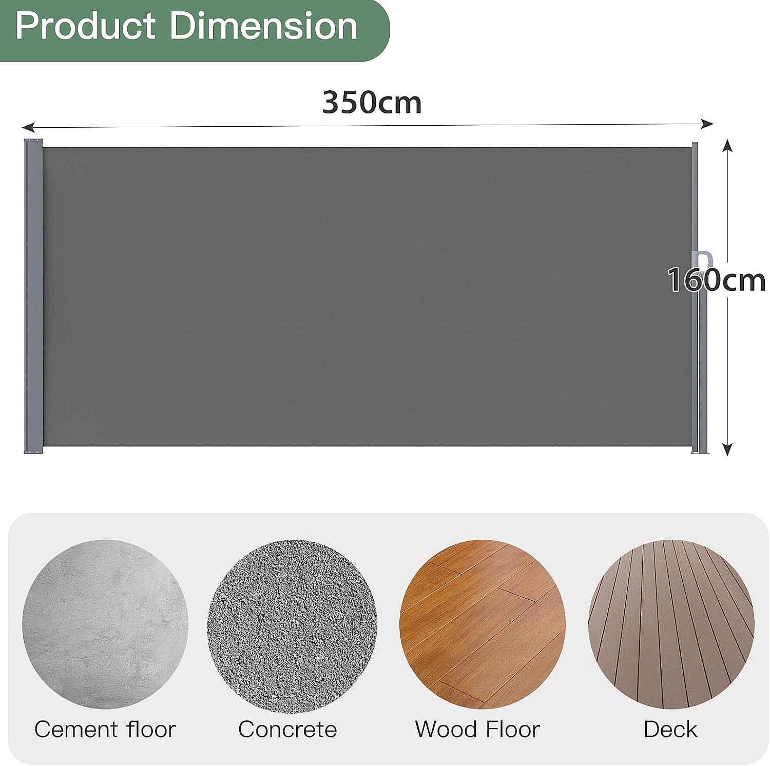 YODOLLA Auvent latéral rétractable 350x160cm extensible, Protection solaire Et intimité imperméable pliable pour jardin balcon terrasse, Gris foncé