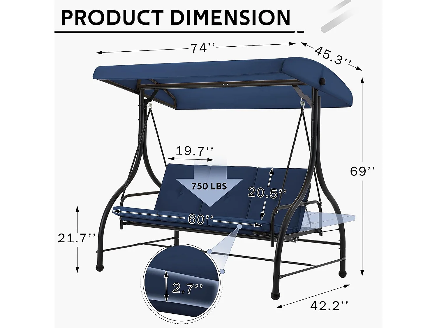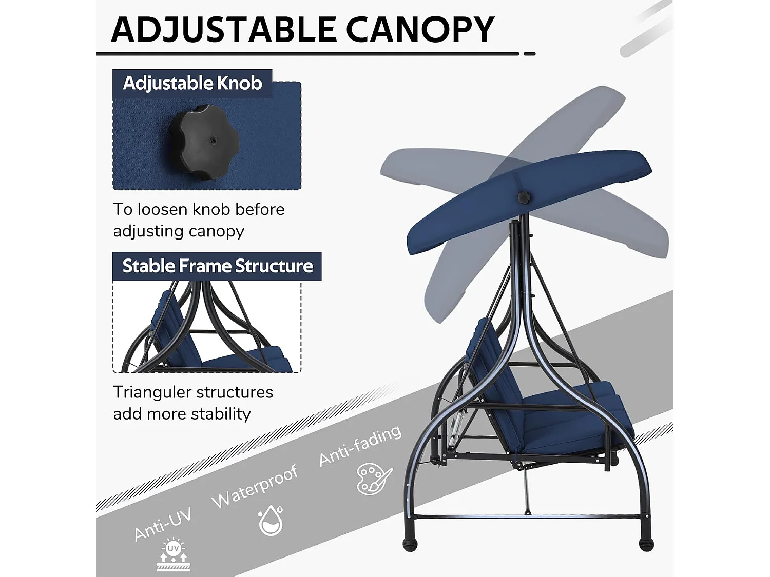 YODOLLA Balancelle de Jardin 3 Places avec Auvant Réglable et Coussins Amovible - 182x108x178 cm - Bleu