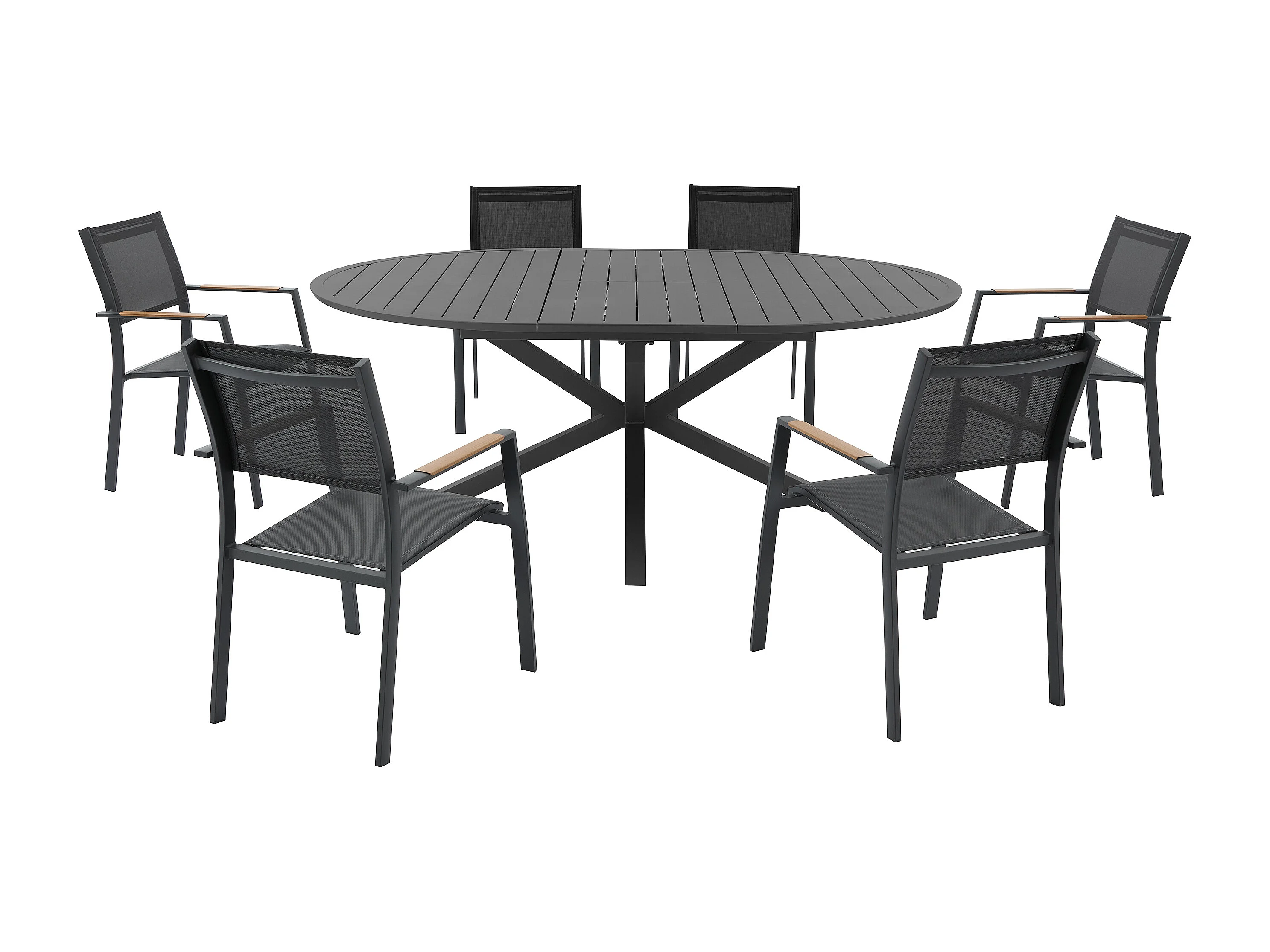 Salle à manger de jardin en aluminium : une table ronde extensible L.150/200 cm et 6 fauteuils empilables - Anthracite - YOHA de MYLIA