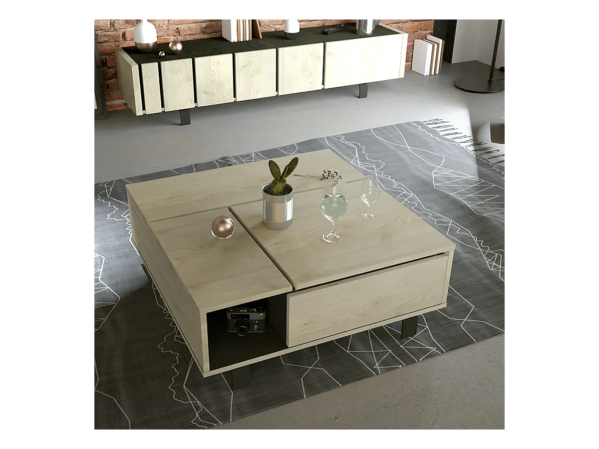 YUMA - Table Basse Relevable Carrée Industrielle Effet Chêne