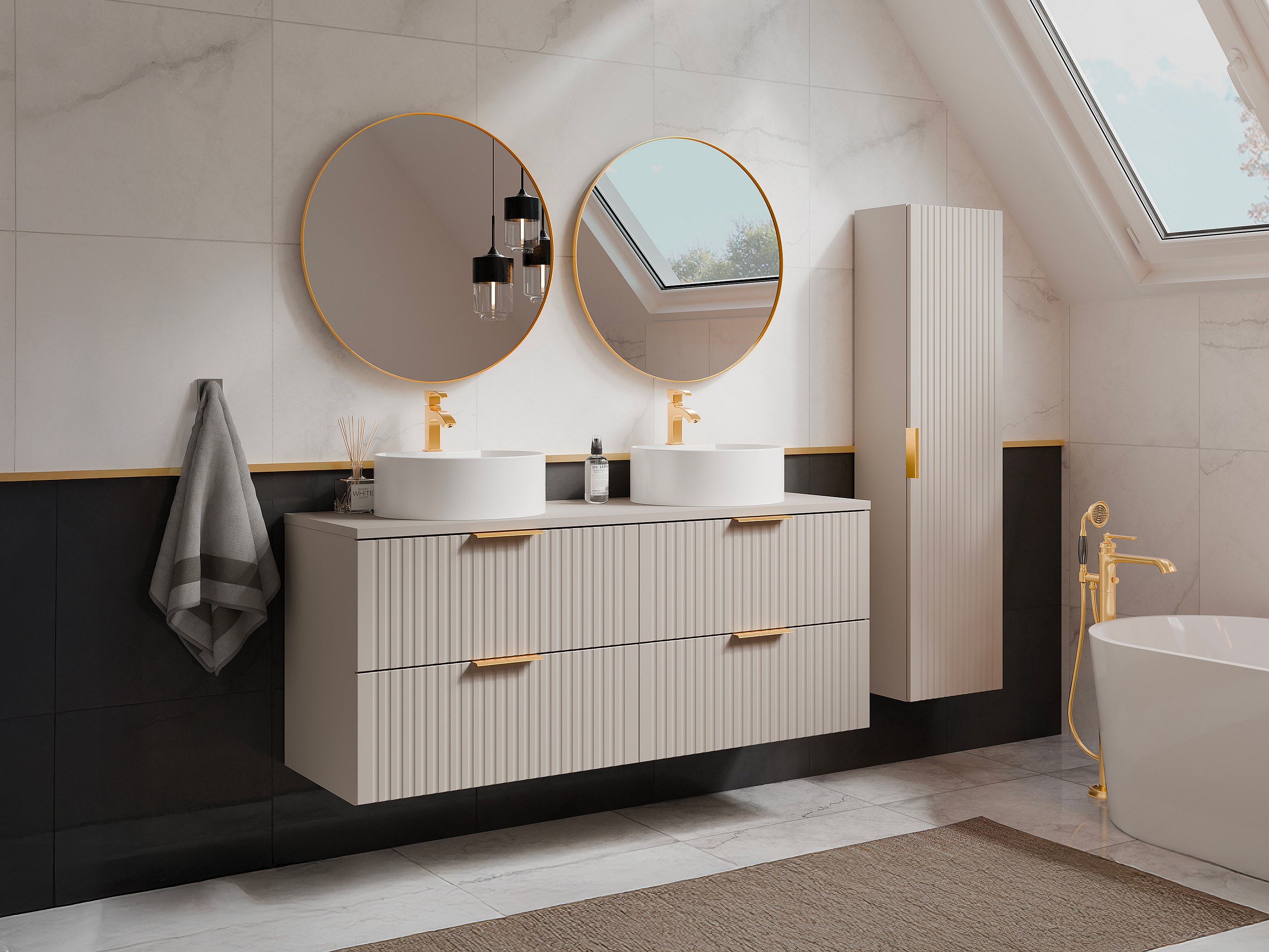 Meuble de salle de bain suspendu strié avec vasque à poser ronde et colonne - Coloris beige - 120 cm - ZEVARA